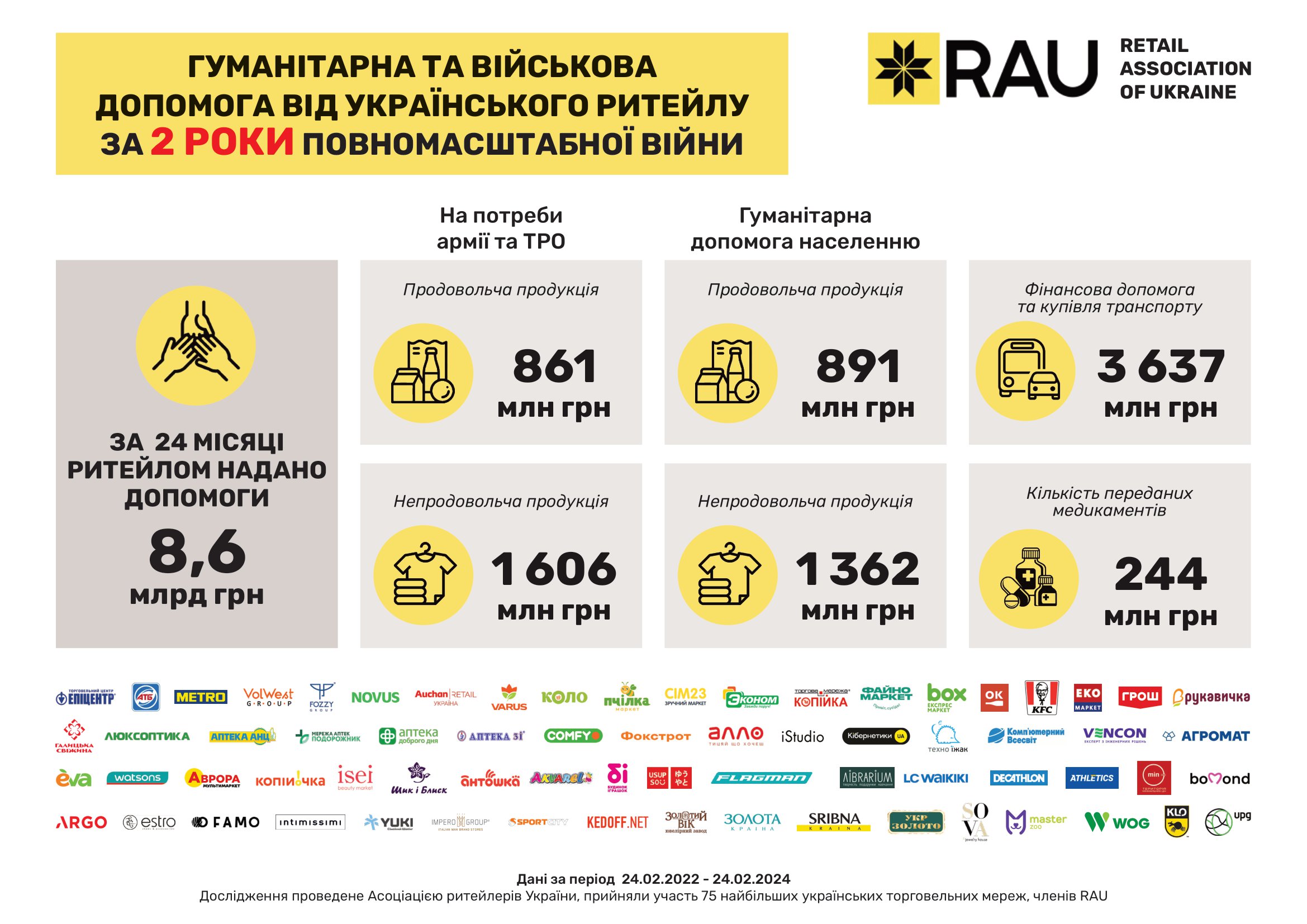 Загалом за два роки війни українські ритейлери зібрали та передали допомоги на суму 8,6 млрд грн. Зокрема, на потреби армії та територіальної оборони було передано продовольчої продукції на суму 861 млн грн та непродовольчої продукції на суму понад 1,6 млрд грн. Населенню було надано продовольчої гуманітарної допомоги на суму 891 млн грн та непродовольчої гуманітарної допомоги на суму понад 1,36 млрд грн.