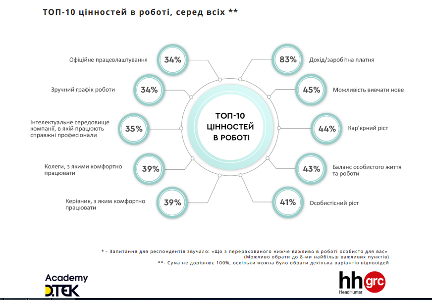 Для всіх поколінь найціннішим в роботі є матеріальний критерій. Для переважної більшості (83%) на першому місці виявився рівень доходу. Але відразу на другому місці – можливість навчитися чомусь новому (45%). Дуже важливими виявилися і інші критерії самореалізації: можливості для кар’єрного та особистісного росту. А також критерії часу: підтримка балансу між роботою та особистим життям.
