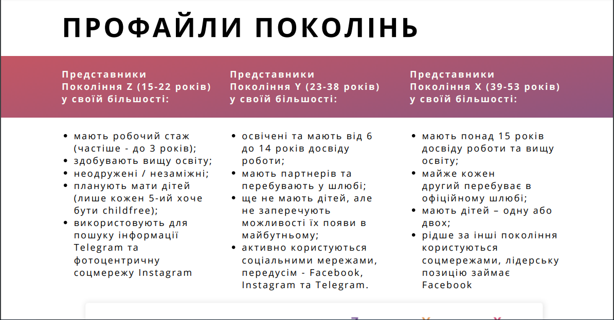 Важлива відмінність: для поколінь Z та Y можливість кар’єрного росту більш значуща (що характеризує їх як досить прагматичних людей), а для покоління X – більш важливо офіційне працевлаштування.