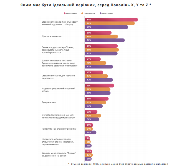 У будь-якому випадку, 81% опитаних хоче в колективі атмосфери взаємної підтримки і співпраці, 66% хочуть поваги до думки підлеглого, навіть якщо вона йде в розріз з позицією керівництва. А також 62% очікують, що керівник буде ділитися з ними своїми знаннями та регулярно давати зворотний зв’язок – 60%. Не менш важливі й прояви довіри до співробітників – за це 54%