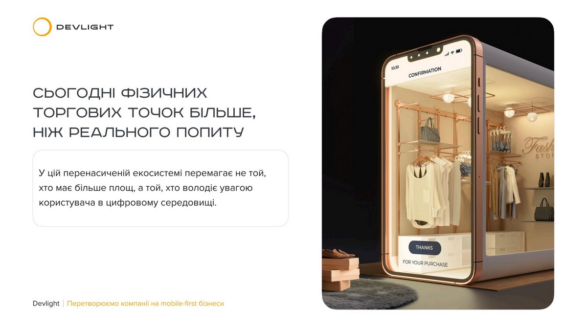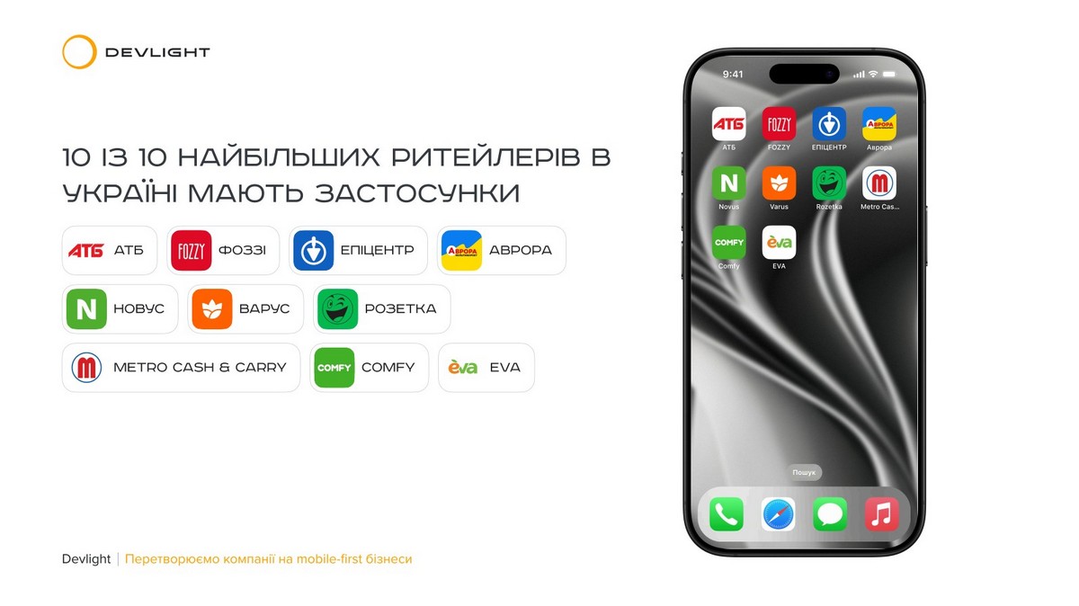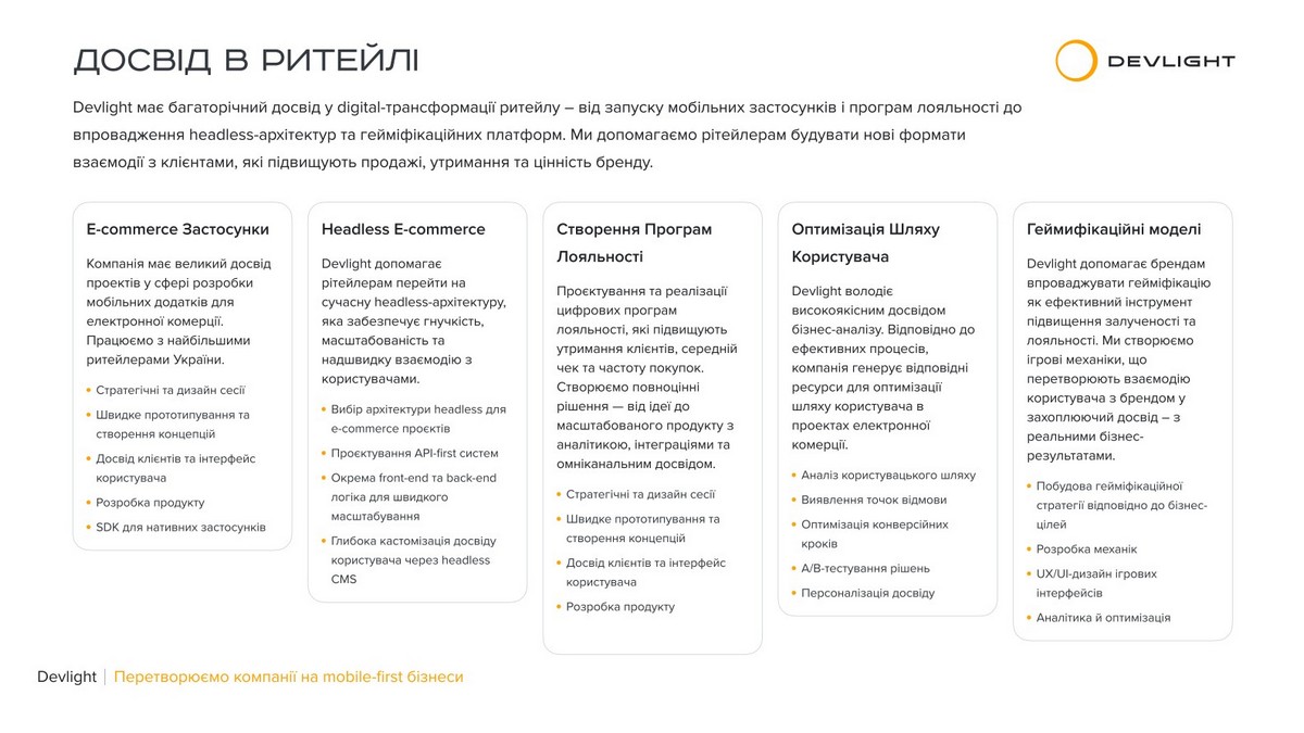 Компанія Devlight працює в Україні дев’ять років. За цей час тут зробили більше 120 застосунків, які загалом були встановлені 36 млн разів. Серед клієнтів – такі великі гравці як Епіцентр, Аврора, Varus, Novus, SOCAR, Ukrnafta, OKWine та інші. Devlight має багаторічний досвід у digital-трансформації ритейлу – від запуску мобільних застосунків і програм лояльності до впровадження headless-архітектур та гейміфікаційних платформ. Аби допомогти ритейлерам будувати нові формати взаємодії з клієнтами, які підвищують продажі, утримання та цінність бренду.