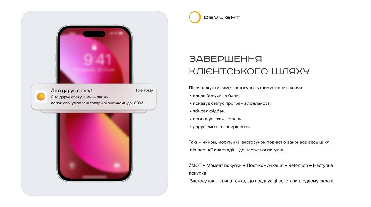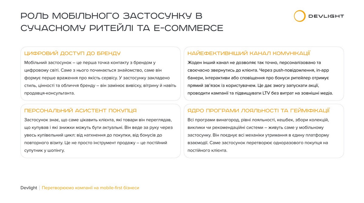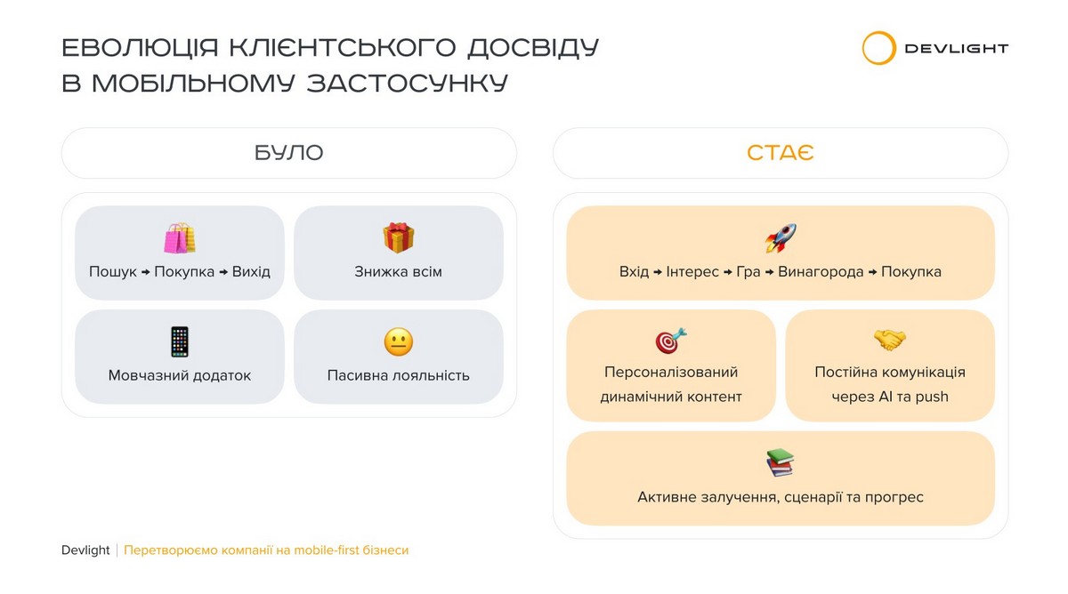 Раніше компанії розглядали застосунок лише як ще один канал продажів або додаткову віртуальну полицю з метою залучення клієнтів у звичайні магазини. І це досі працює. Але тепер застосунок повинен не тільки “обслуговувати продажі”, а постійно повертати увагу користувача через залучення та гру. Сучасна роль застосунку – цифровий доступ до бренду в режимі 24/7 і найефективніший канал комунікації.