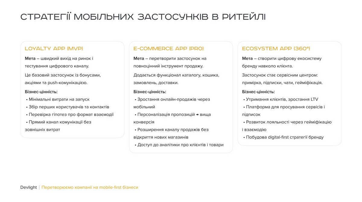 Найбільш оптимальною стратегія розвитку мобільного застосунку виглядає наступним чином. Спочатку варто рухатися від програми лояльності для того, щоб оцифрувати свою базу клієнтів, вибудувати канал гейміфікації із нею і почати взаємодію.