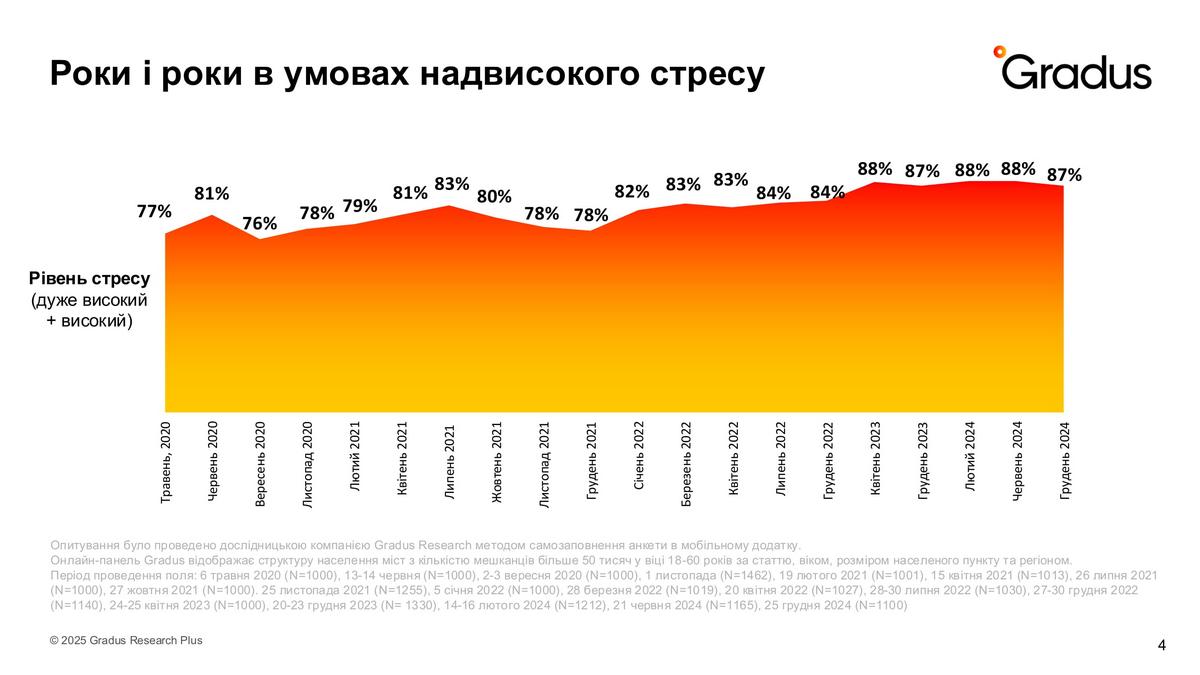 Українці вже тривалий час живуть у стані високого стресу: майже 90% опитаних кажуть про високий або дуже високий рівень. Цей показник не знижується з травня 2020 року, коли пандемія Covid-19 досягала свого піку, а потім почалося повномасштабне вторгнення рф.