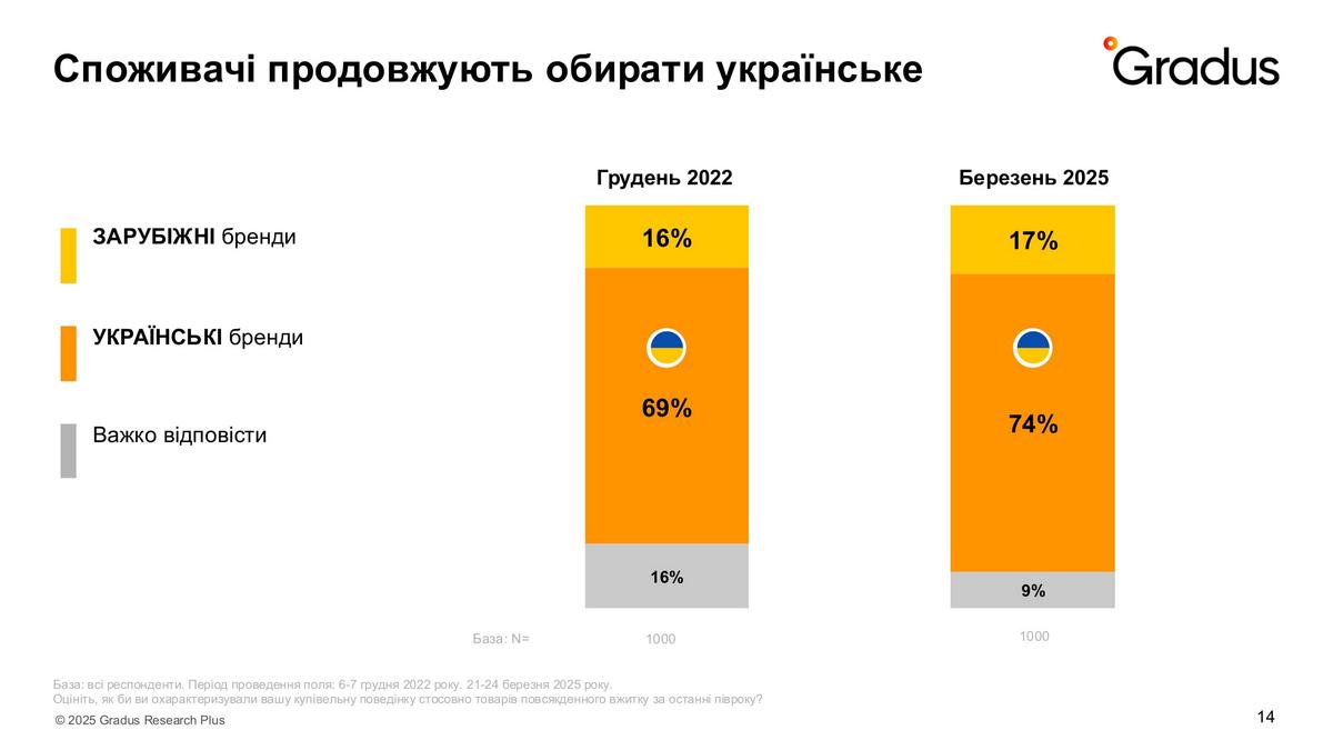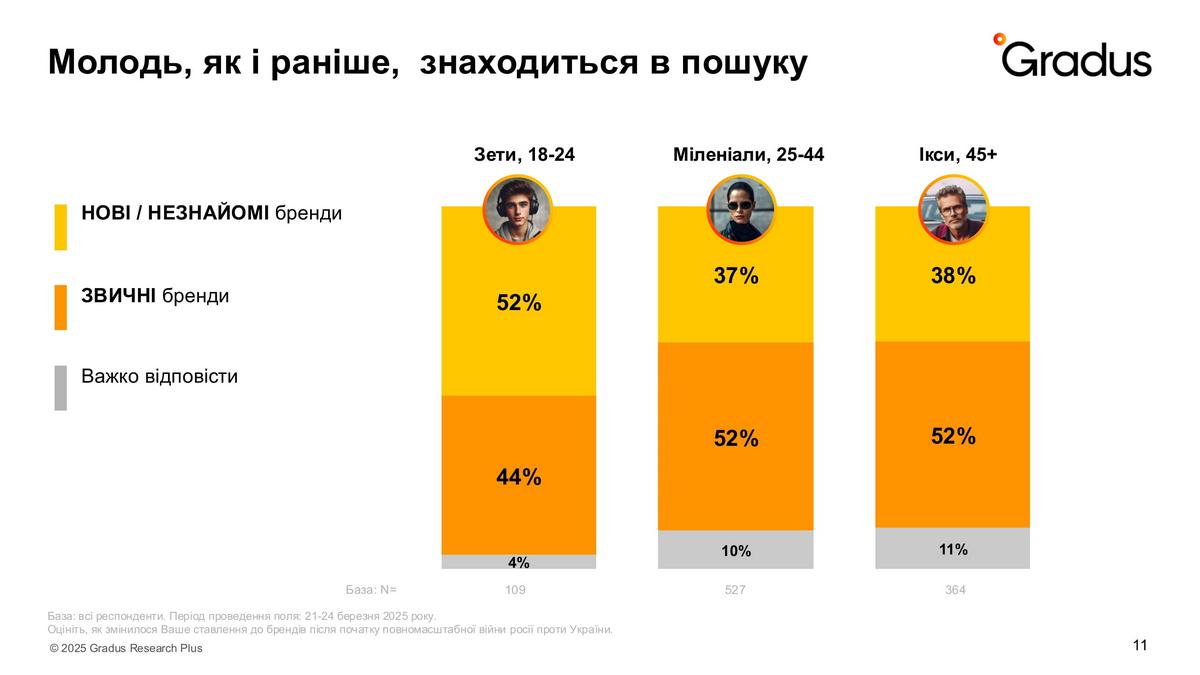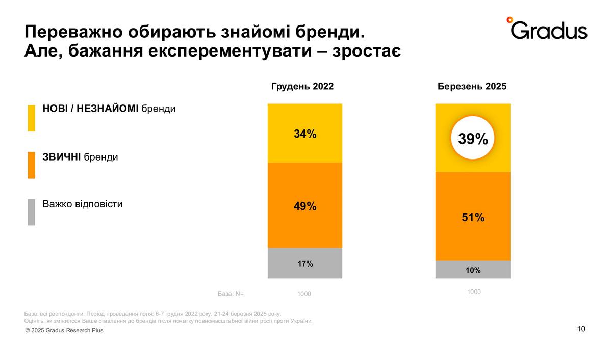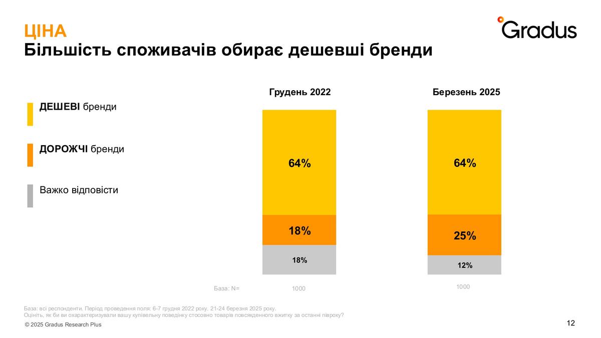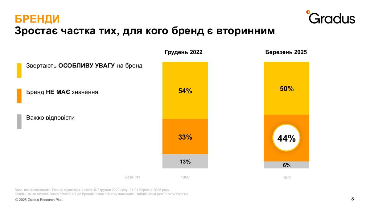 Проте вже в березні 2025 року значно побільшало тих, хто взагалі не звертає увагу на бренди (44% проти 33%). Хоча й тих, хто вибирає свої улюблені марки все ще 50%. Дослідники припустили, що через загальний економічний стан не всі українці можуть собі дозволити звертати увагу на бренд, а лише на ціну. Тому глибше дослідили цей тренд.