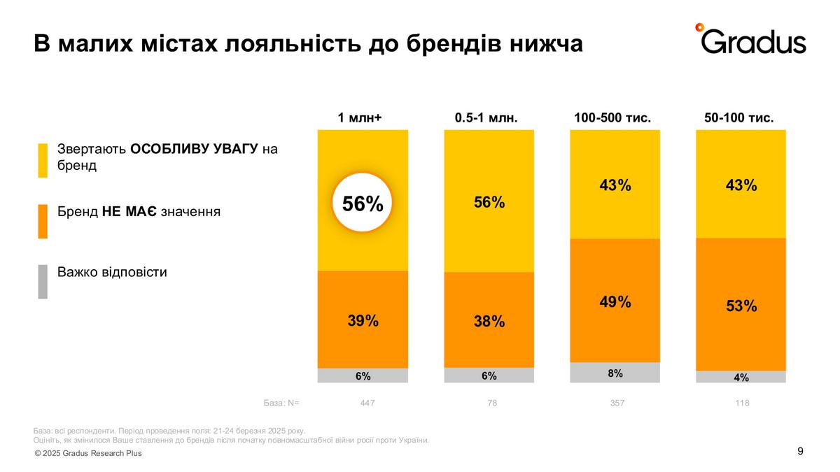 Аналіз поведінки споживачів у різних містах показав, що особливу увагу до бренду мають люди у містах-мільйонниках. Вочевидь, чим менше населений пункт, тим менше там бренд має значення.