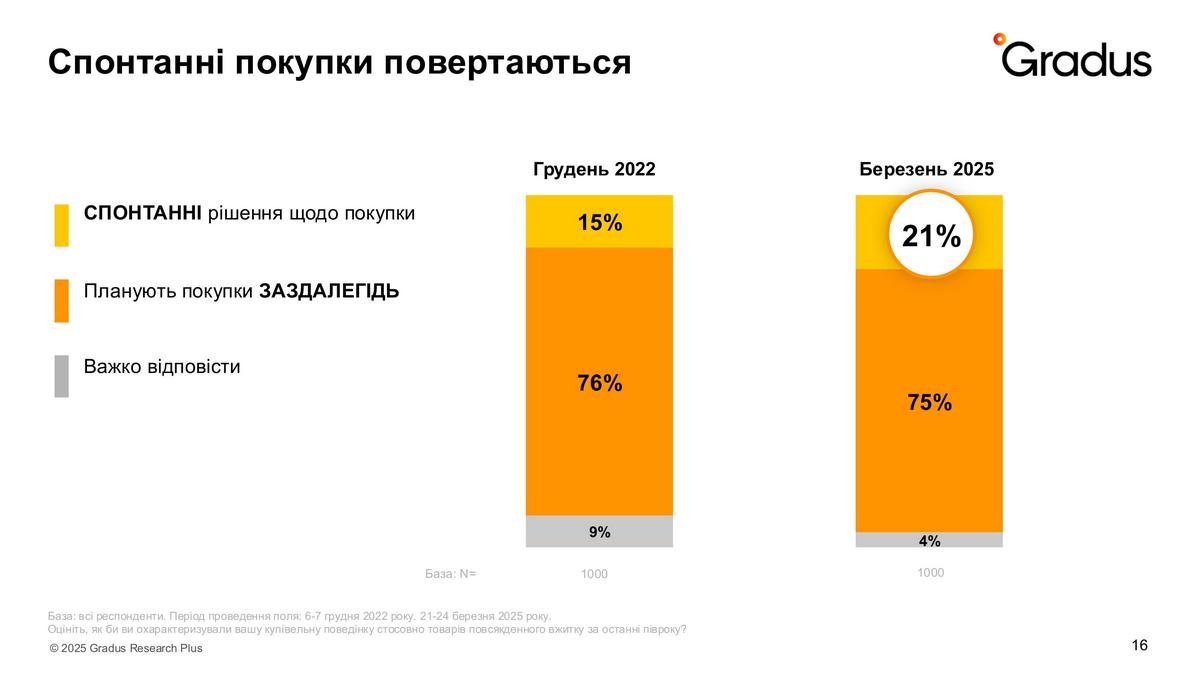 Нове дослідження також показало збільшення частки спонтанних покупок. На початку повномасштабної цей фактор споживання майже зник, бо люди не знали, що станеться завтра. Але до кінця 2022 року частка імпульсивних покупок вже становила 15%.