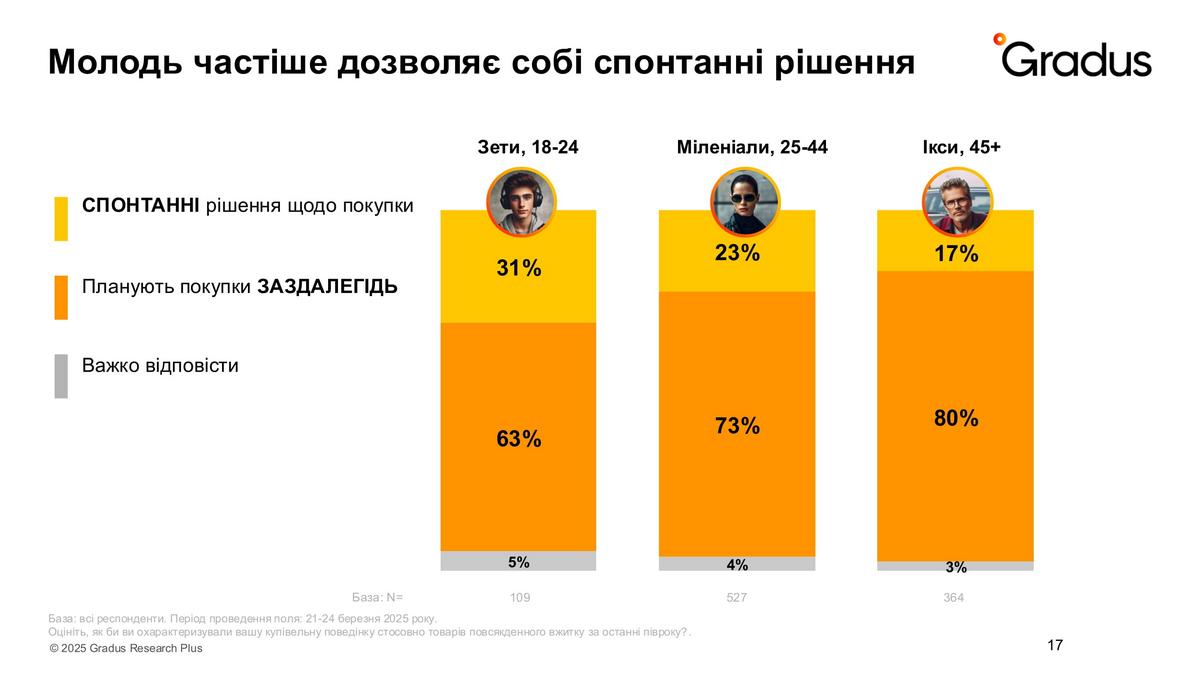 Як показав перехресний аналіз, стрес, який переживають українці, дуже впливає на імпульсивне придбання товарів під гаслом «коли як не зараз». Якщо молодь більше готова жити одним днем, то люди з покоління X більш схожі на європейців, які планують свої витрати, та й загалом своє життя, бо в них є стабільність та розуміння, що буде далі.