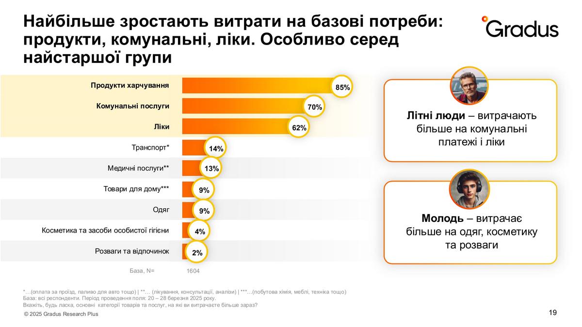 Зі зрозумілих причин молодь більше витрачає на одяг, косметику та розваги. Літні ж люди, навпаки, більше відчувають трати на комуналку та ліки.