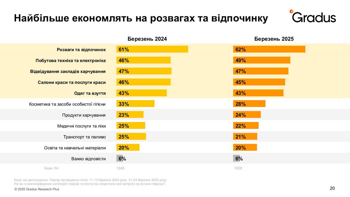 Загалом найбільше опитані українці схильні до економії на розвагах та відпочинку. Втім, дослідники не бачать кардинальних змін в динаміці. Так само як і раніше споживачі намагаються економили на побутовій техніці та відвідуванні закладів харчування.