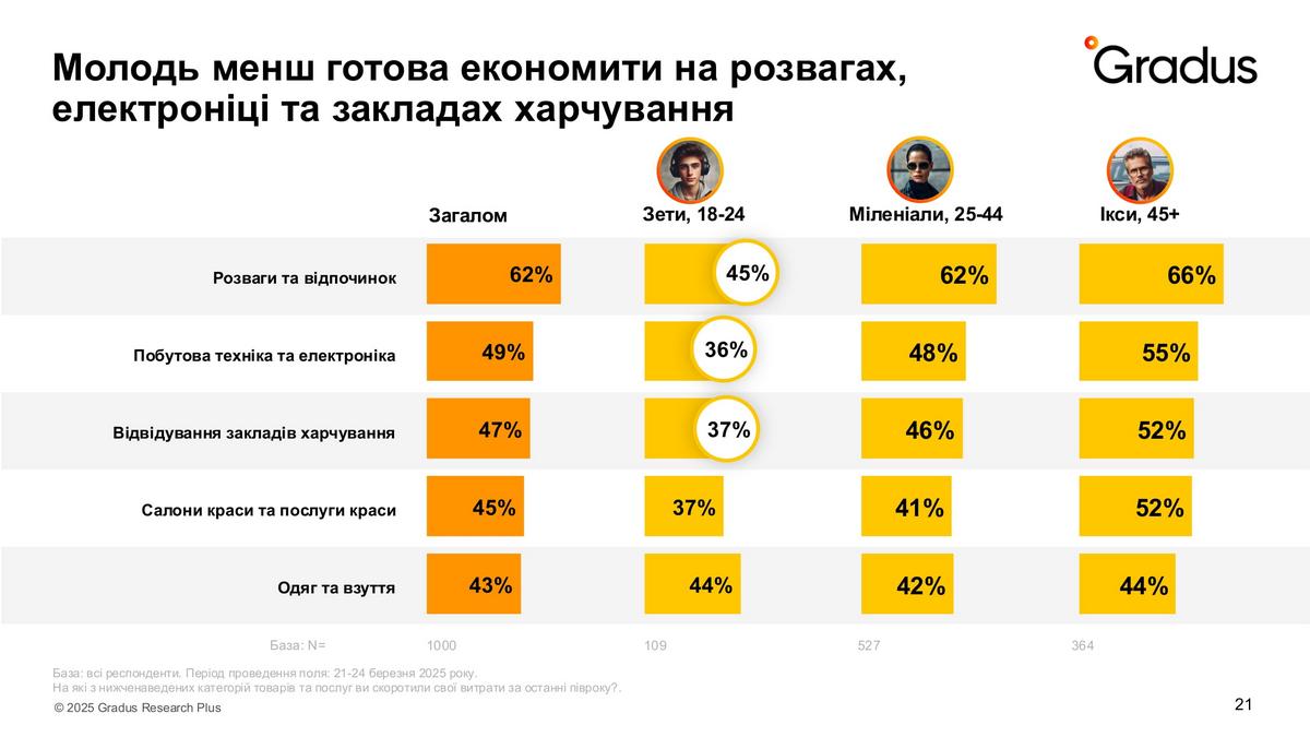 Попри те, що розваги та відпочинок на першому місці серед витрат, на яких всі намагаються зекономити, у наймолодших споживачів цього бажання найменше. Так само 36-37% серед покоління Z готові менше витрачати на побутову техніку та електроніку й на відвідування закладів харчування. В той час, коли серед представників інших поколінь таких понад половину. Але їх всіх об’єднує бажання економити на покупці одягу та взуття – 44% респондентів зазначили, що вони готові та вже економлять саме на цих категоріях.