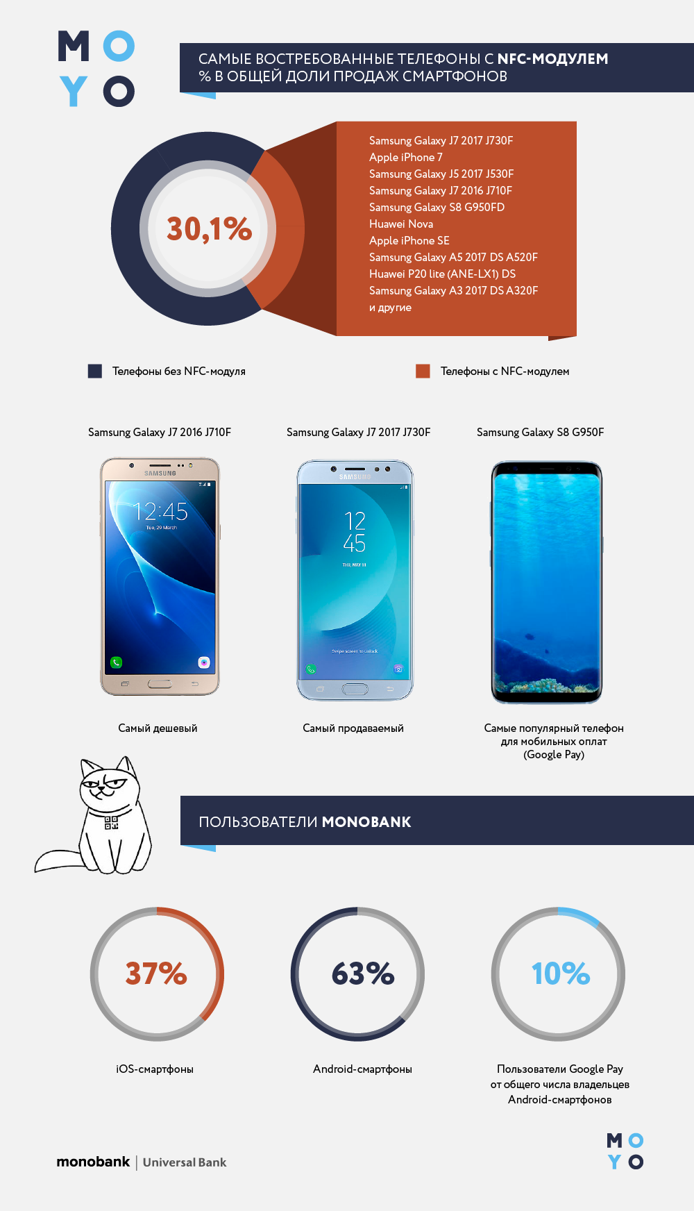 Згідно зі статистикою продажів MOYO, за перші шість місяців 2018 року, близько 30% всіх придбаних українцями смартфонів оснащені NFC-модулем. При цьому серед гаджетів, які підтримують мобільні платежі, близько 10% припадає на різні моделі iPhone, а 90% — на Android-смартфони.