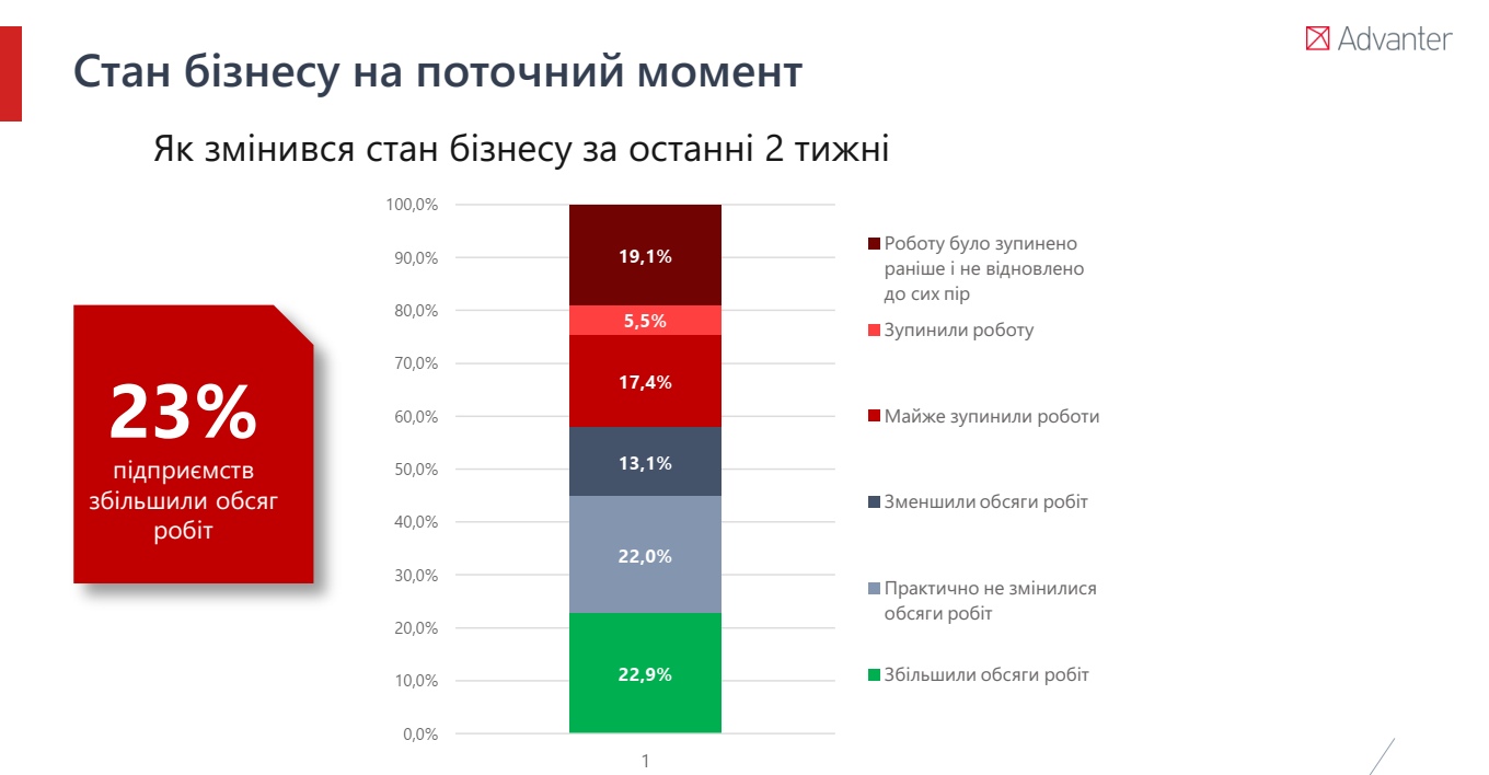 На шляху до відновлення: 23% підприємств збільшили обсяг робіт за два тижні квітня – дослідження Advanter Group