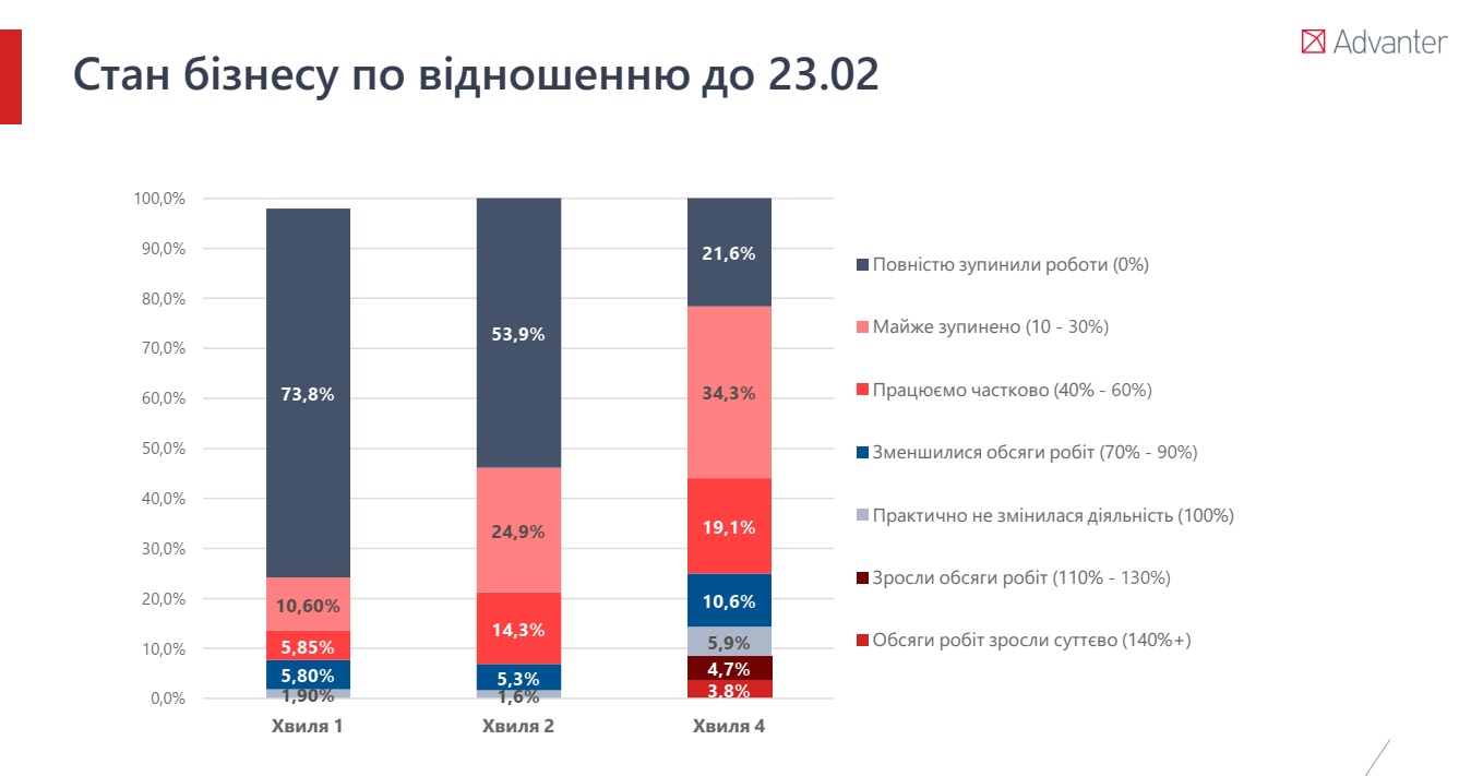 Порівняно з 23 лютого, кількість підприємств, які не працюють повністю або частково, наразі становить майже 56%. При цьому частка повністю зупинених бізнесів скоротилася до 21,6%.