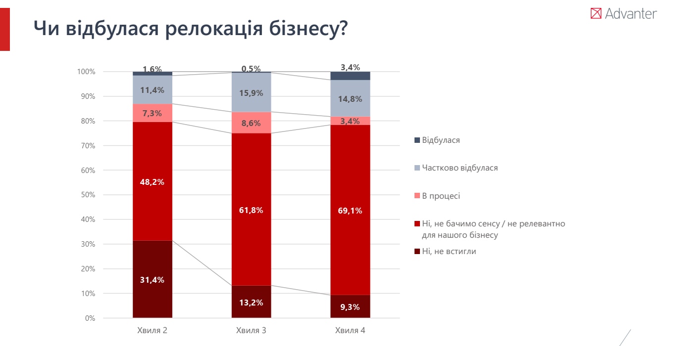 При цьому 12% підприємств провели або проводять релокацію повністю або переважно за кордон.