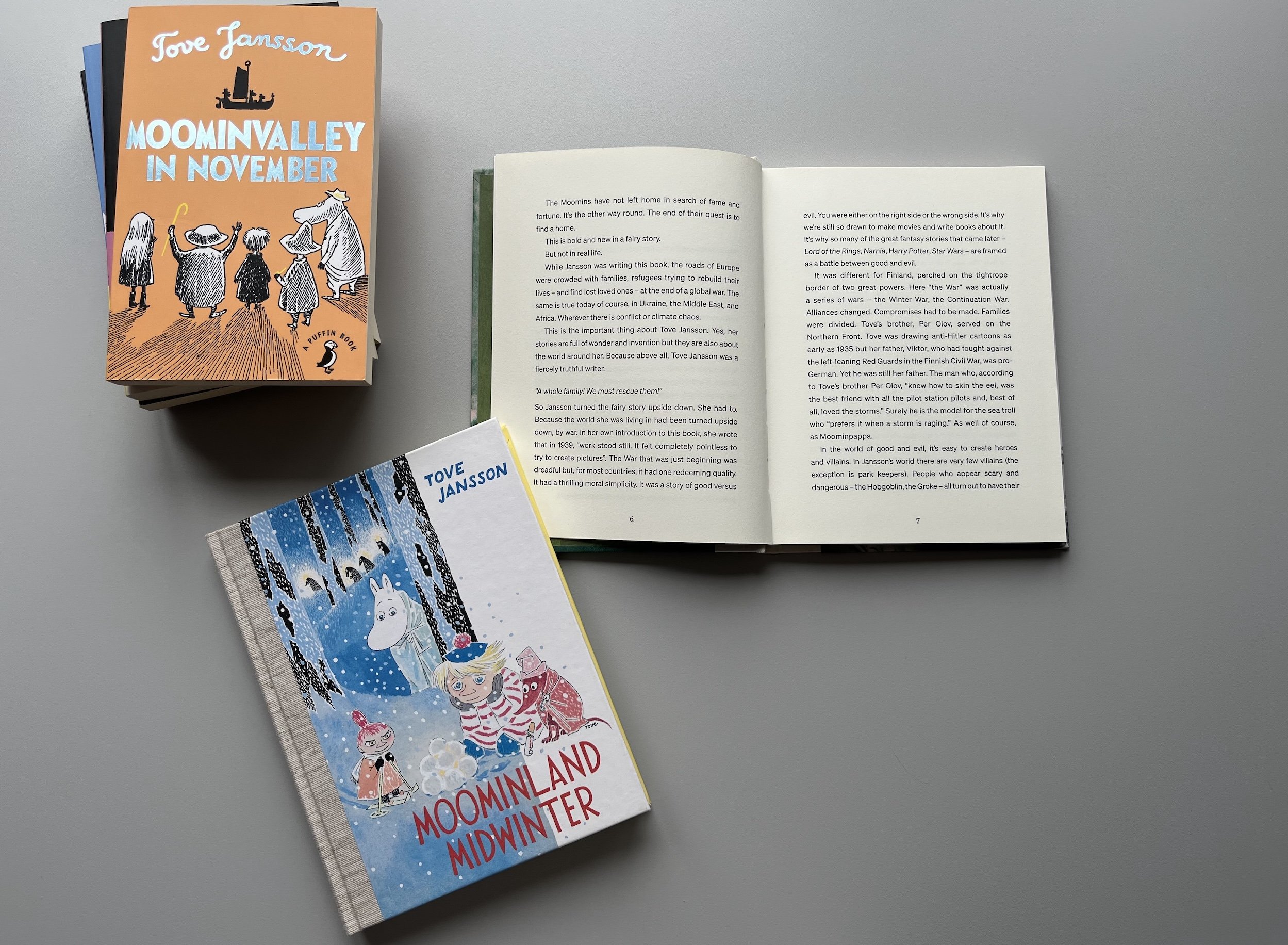 Написані під час війни перші дві повісті Янссон мають щасливі фінали: Мумі-тролі знайшли батька й дім, а комета, що мала б знищити Мумі-долину, оминула її. Ці книжки побачили світ уже після закінчення Другої світової, та напрочуд точно передають настрої та страхи сучасності — коли війни та воєнні конфлікти у світі все ще тривають.