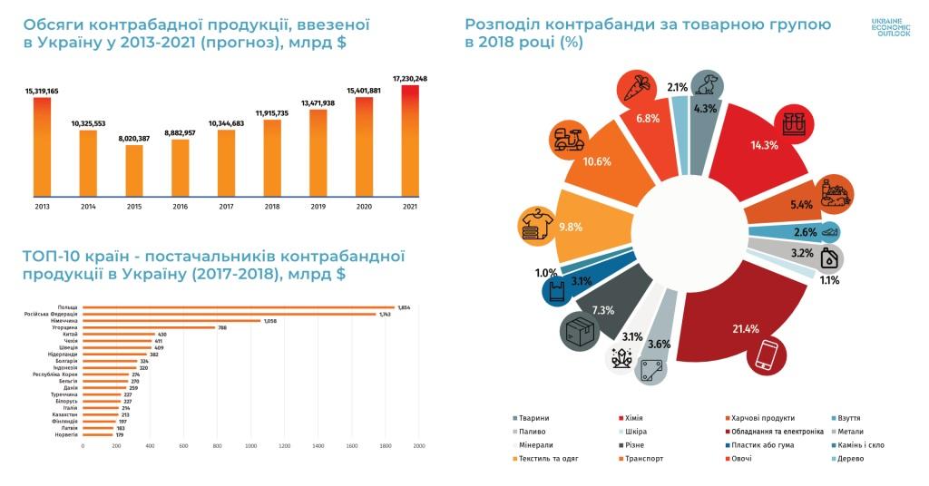 Незважаючи на регулярні вимоги перших осіб держави зменшити, а то і зовсім припинити потік «сірого» і «чорного» імпорту, він продовжує наростати. За прогнозами Ukraine Economic Outlook, за підсумками цього року обсяги контрабанди виростуть до $13,5 млрд, а до 2021 року подолають позначку в $17,2 млрд.