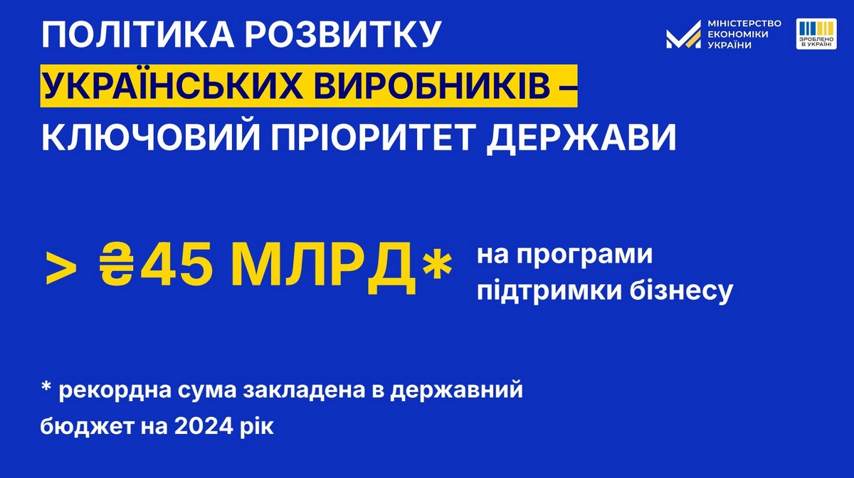Міністерство економіки багато говорить про підтримку вітчизняних виробників. В 2024 році на різні програми підтримки бізнесу в бюджеті було заплановано рекордну суму – 45 млрд грн. Фокус на локальному виробництві, вочевидь, зумовлений необхідністю розвивати українську економіку, а не іноземні підприємства. За підрахунками фахівців міністерства, приблизно 40% вартості локального продукту повертається назад в економіку, слугуючи в подальшому збільшенню ВВП. Серед основних програм підтримки варто згадати “Доступні кредити 5-7-9%”, “Індустріальні парки” та “Гранти для переробних підприємств”, часткову компенсацію вартості техніки в розмірі 15% тощо.