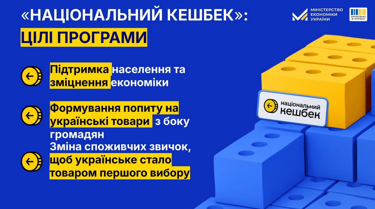 Національний кешбек – це ще один проєкт, програма лояльності державного рівня, дія якої планується до кінця 2025 року. Одна з головних цілей проєкту – змінити споживчі звички, щоб українське стало товаром першого вибору.