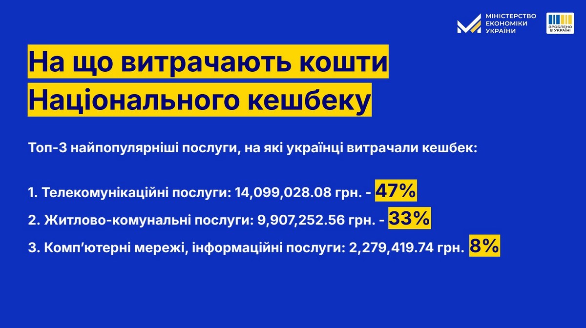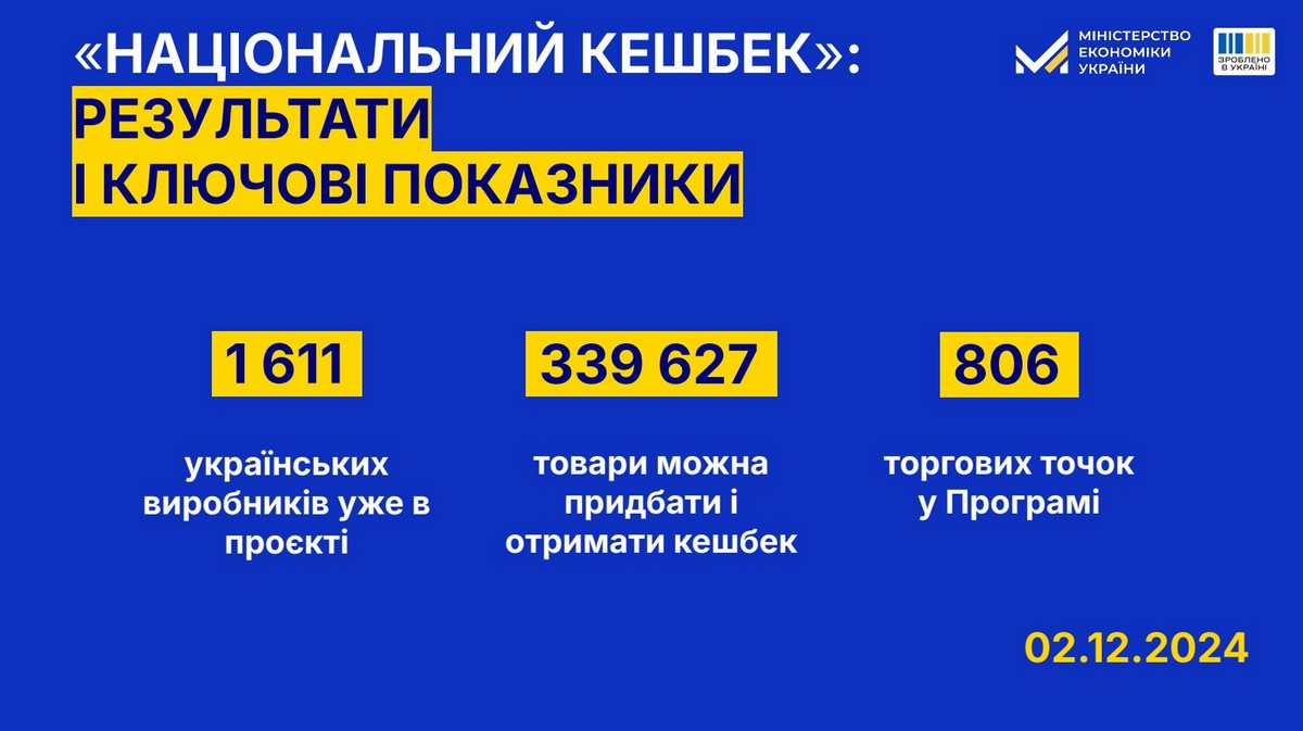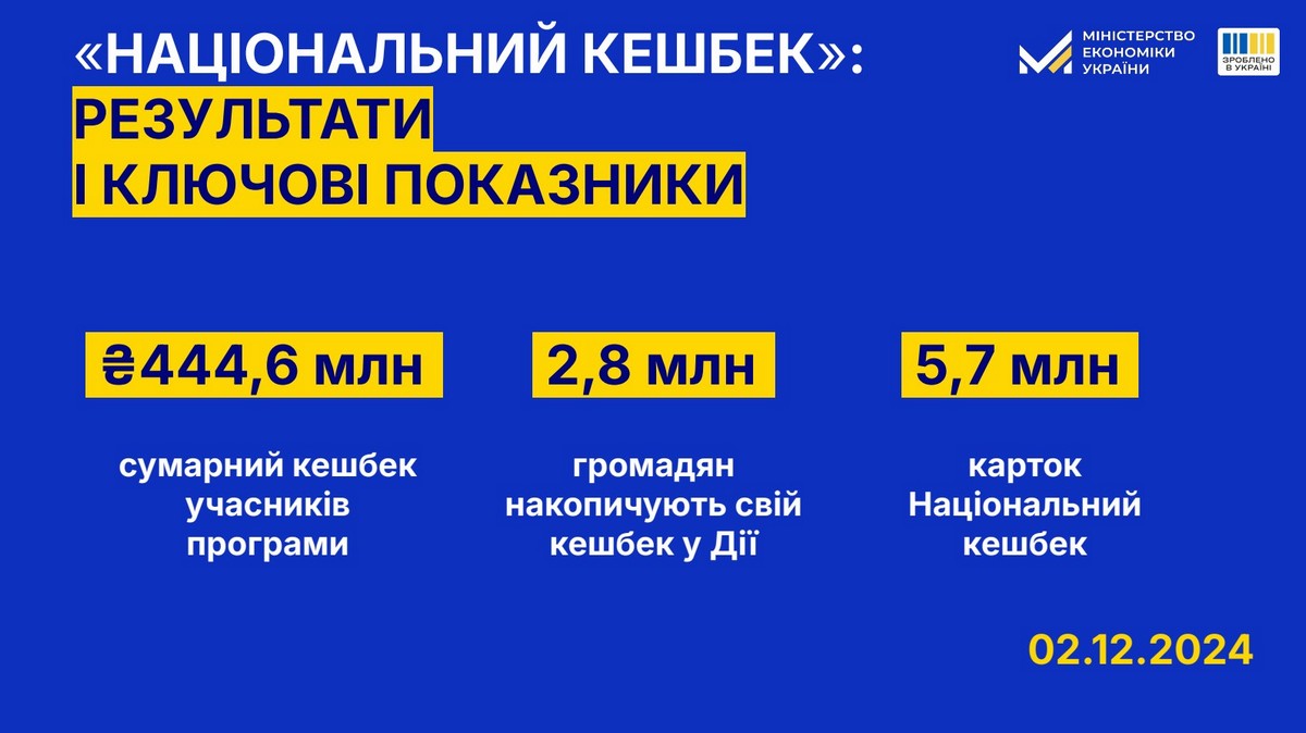Після запуску програми Національний кешбек українські виробники, за даними Міністерства економіки, зазначають, що їм стало простіше потрапити на полиці українських магазинів. За три місяці роботи програми (включаючи тестовий період у вересні) сума нарахованого кешбеку становила майже 445 млн грн. Із них вже виплачено понад 156 млн грн (за вересень та жовтень), а за листопад гроші прийдуть на картки в 20-х числах грудня. Станом на 2 грудня активними учасниками програми стали 2,8 млн людей, а загалом же було відкрито 5,7 млн карток Національний кешбек.
