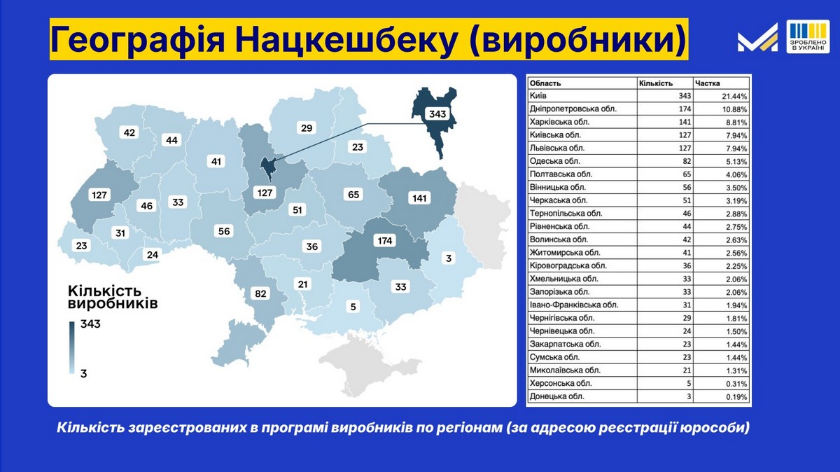 У програмі представлені виробники практично з усіх регіонів, в тому числі три компанії з Донецької області. Найбільше зареєстрованих учасників, звісно, в столиці — 343. На другому місці Дніпропетровська область (174 компанії), третя — Харківська область, 141 виробник. Це певною мірою відображає промисловий розвиток країни та регіони з найбільшою концентрацією виробництв.