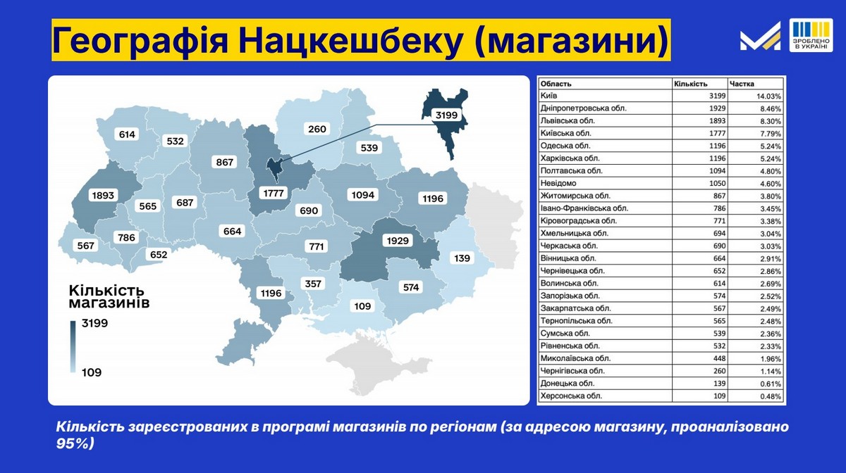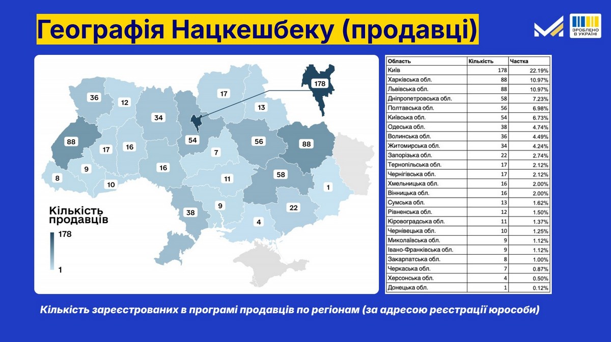 Аналогічно підприємства торгівлі мають дещо схожий географічний розподіл, але зі своїми особливостями. Так, на Донеччині є лише один ритейлер, задіяний в програмі “Національний кешбек”, а в трійку лідерів, яку також очолює Київ (178 компаній), увійшли Харків та Львів з однаковою кількістю ритейлерів – по 88 компаній.