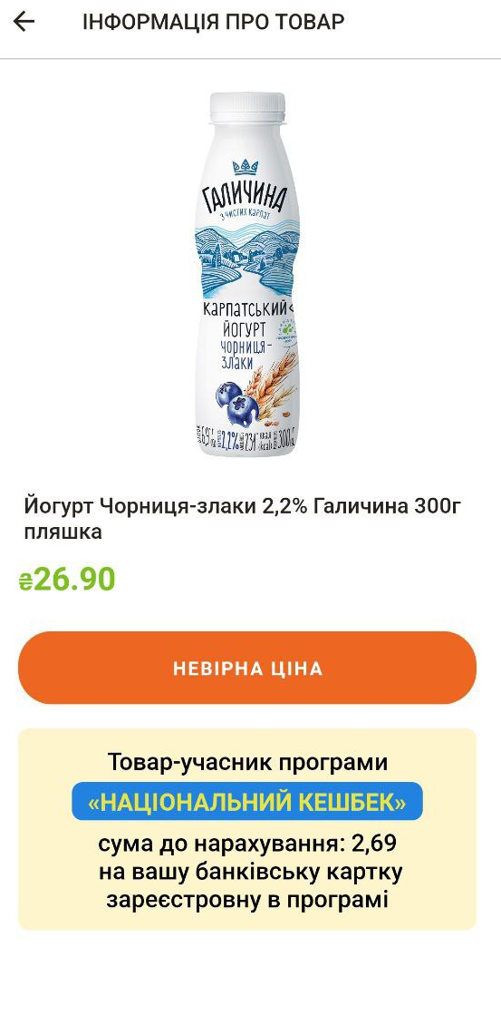 - Навести «Сканер» на штрих-код товару. Окрім ціни, ви отримаєте інформацію про участь товару у програмі та суму кешбеку за його покупку.
