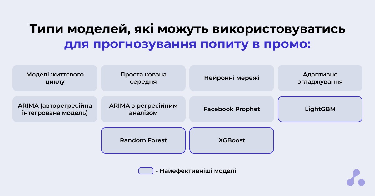 Ми експериментували з різними алгоритмами прогнозування попиту в промо й залишили ті, що довели свою ефективність у реальних проєктах: LightGBM, Random Forest і XGBoost.