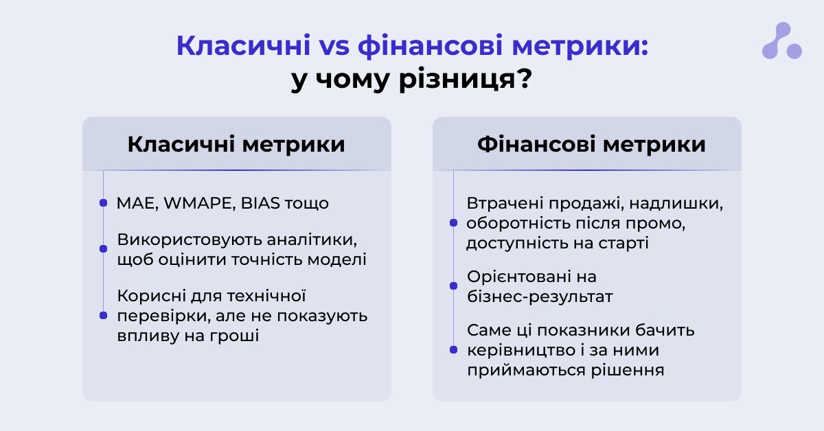 У роботі з прогнозами є класичні метрики, знайомі аналітикам: MAE, WMAPE, BIAS. Вони потрібні для оцінки моделі з технічного боку, але вони не дають прямої відповіді на запитання: «А скільки ми заробили чи втратили?»