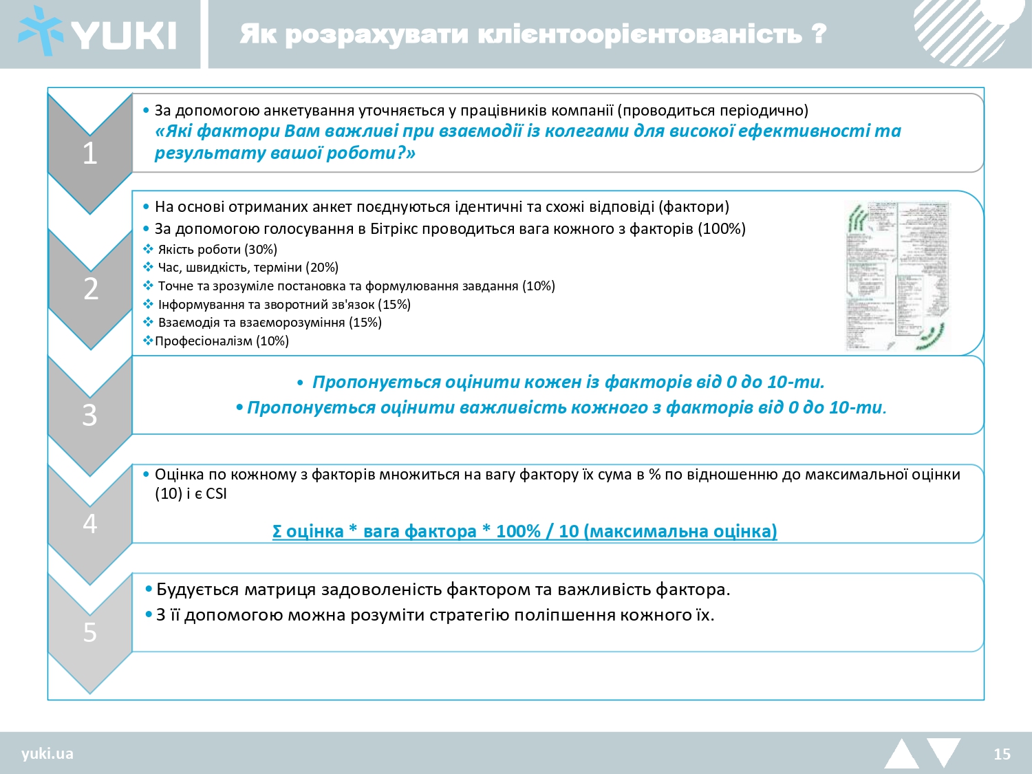 Пропонується оцінити важливість кожного з факторів від 0 до 10-ти. Оцінка по кожному з факторів множиться на вагу фактору їх сума в % по відношенню до максимальної оцінки (10) і є CSI.