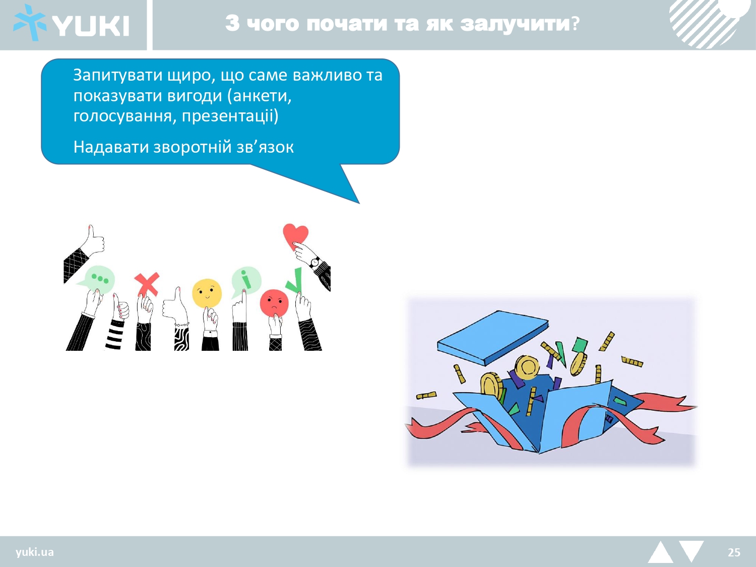 Потрібно запитувати щиро, що саме важливо та показувати вигоди (анкети, голосування, презентаціі) та надавати зворотній зв’язок.