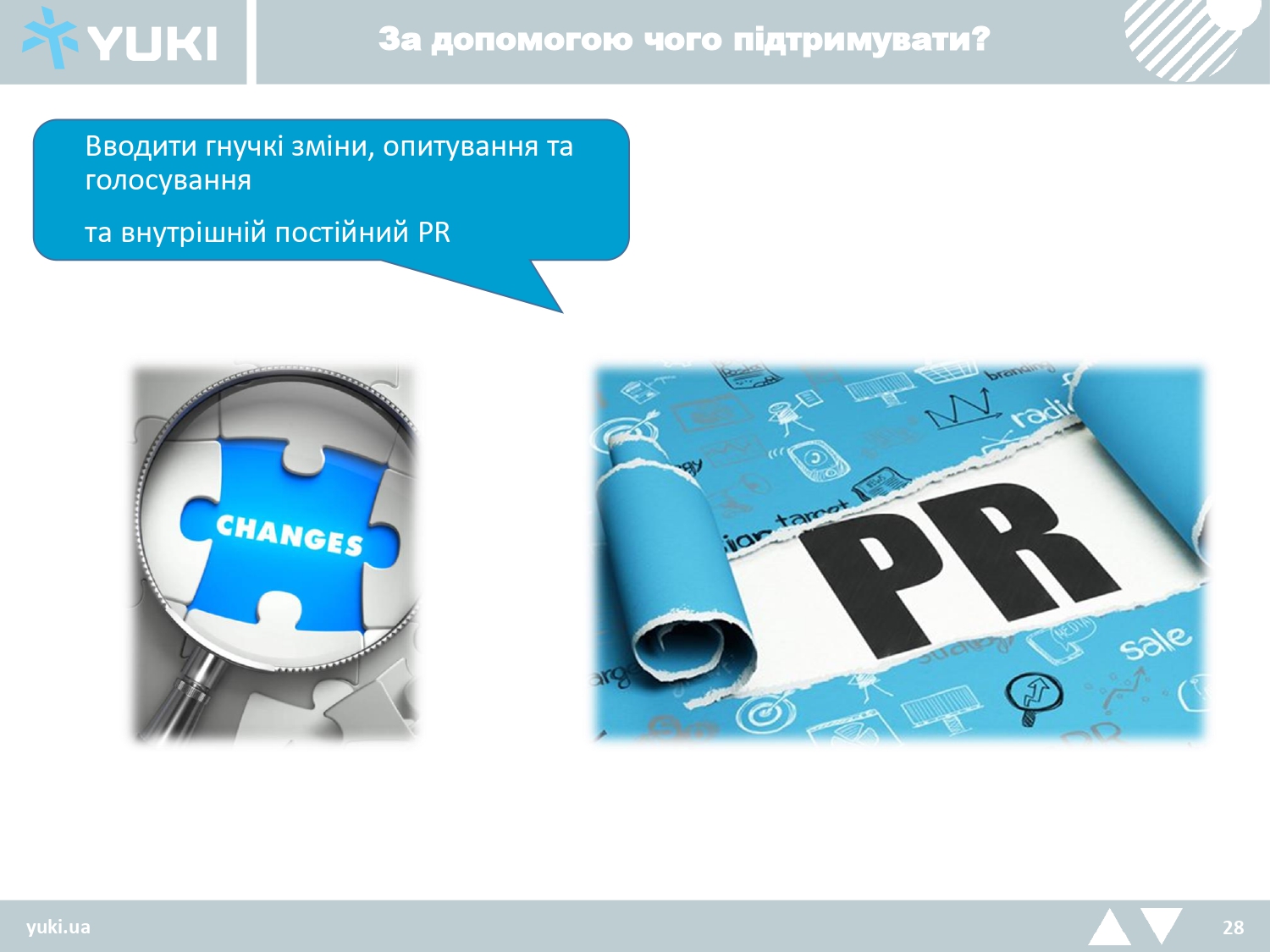 Необхідно вводити елементи змагань та заохочень, гнучкі зміни, опитування та голосування, а також внутрішній постійний PR.
