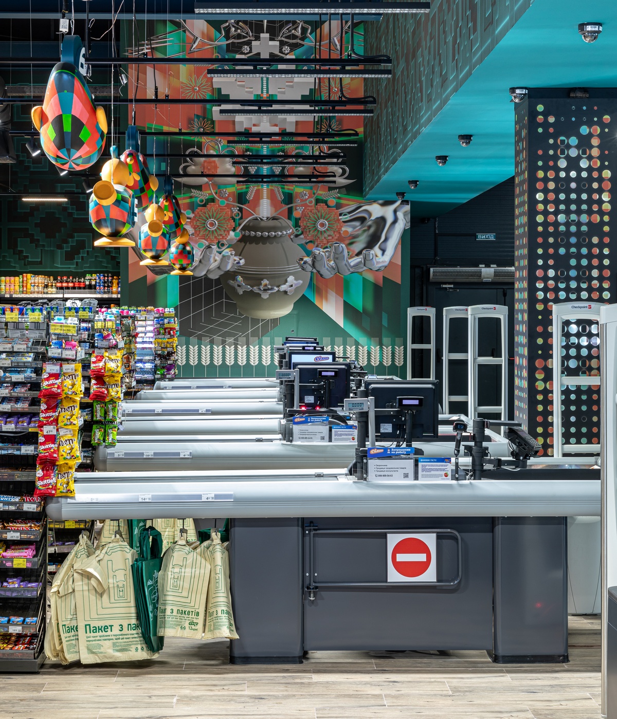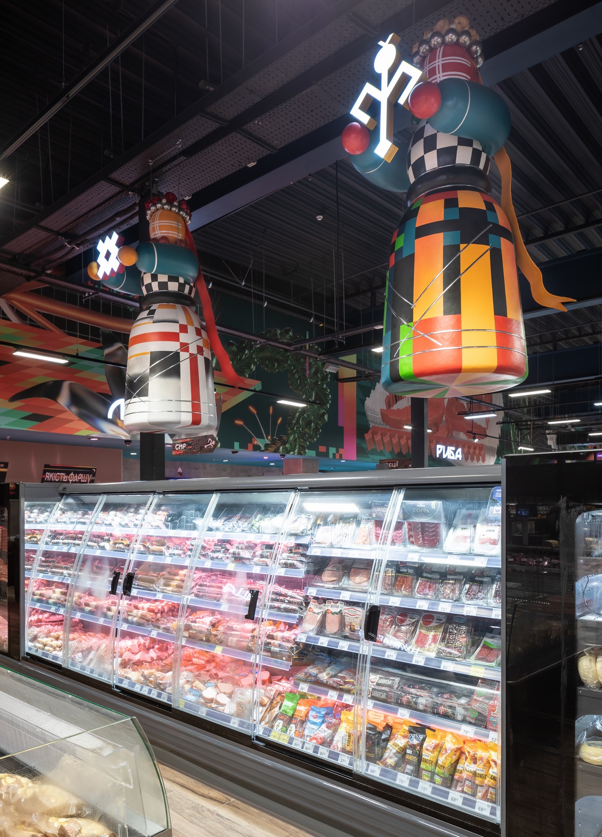 Між рядами страв з кулінарії тут простягаються піксельні вишивки з різних регіонів України. “Ляльки-мотанки оберігають процеси випікання найзапашнішого хліба. А свищики контролюють процеси купівлі товарів на касах”, – пояснювали в Сільпо.