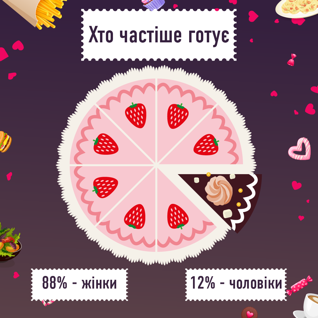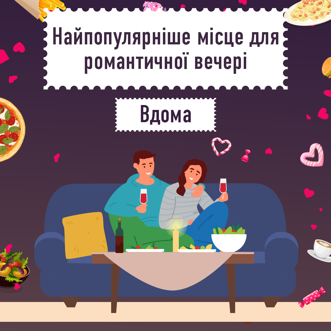 За словами конкурсантів, одним із основних місць для теплого вечора з другою половинкою є домівка, де закохані можуть розслабитися та чудово провести час, поласувавши смаколиками. До речі, серед найпопулярніших романтичних страв перше місце посідають суші, на другій сходинці – піца, а закриває трійку лідерів – шашлик. Окрім того, якщо вечеря не замовляється із ресторану чи кафе, то її зазвичай готує жінка – як показали відповіді конкурсної анкети, так відбувається у 88% випадках.