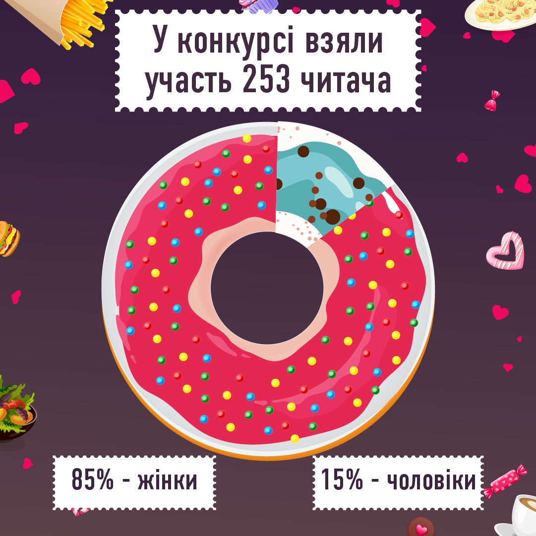 Своїми смачними історіями поділилися 253 читачі, які й стали учасниками конкурсу. Примітно, що жінки значно активніше готові занурюватися у спогади та переповідати їх. Так, 85% учасників проекту склала прекрасна половина людства.
