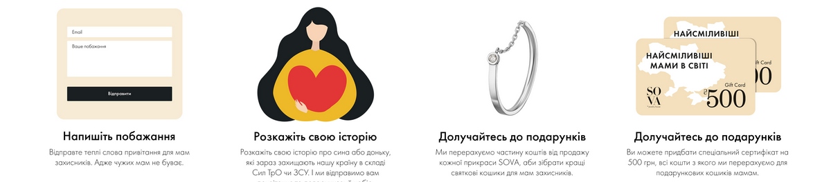 З 1 по 31 травня ми перераховуємо частину коштів від продажу кожної прикраси SOVA, аби зібрати кращі святкові кошики та подарувати теплі слова та усмішку мамі, чий син чи донька наразі не можуть привітати її особисто, адже боронять Свободу країни. До того ж, в усіх працюючих магазинах SOVA можна придбати спеціальний сертифікат на 500 грн, всі кошти з якого ми також перерахуємо для подарункових кошиків мамам. В кожний кошик ми покладемо важливі подарунки та багато-багато любові.