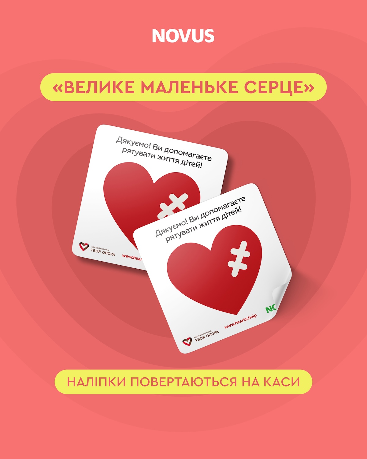 На касах магазинів Novus ви знову можете придбати наліпки у вигляді серця — паперові за 10 грн та світловідбивні за 55 грн та долучитися до важливої справи. Усі кошти з продажу продукції будуть передані на лікування дітей з вродженими вадами серця.