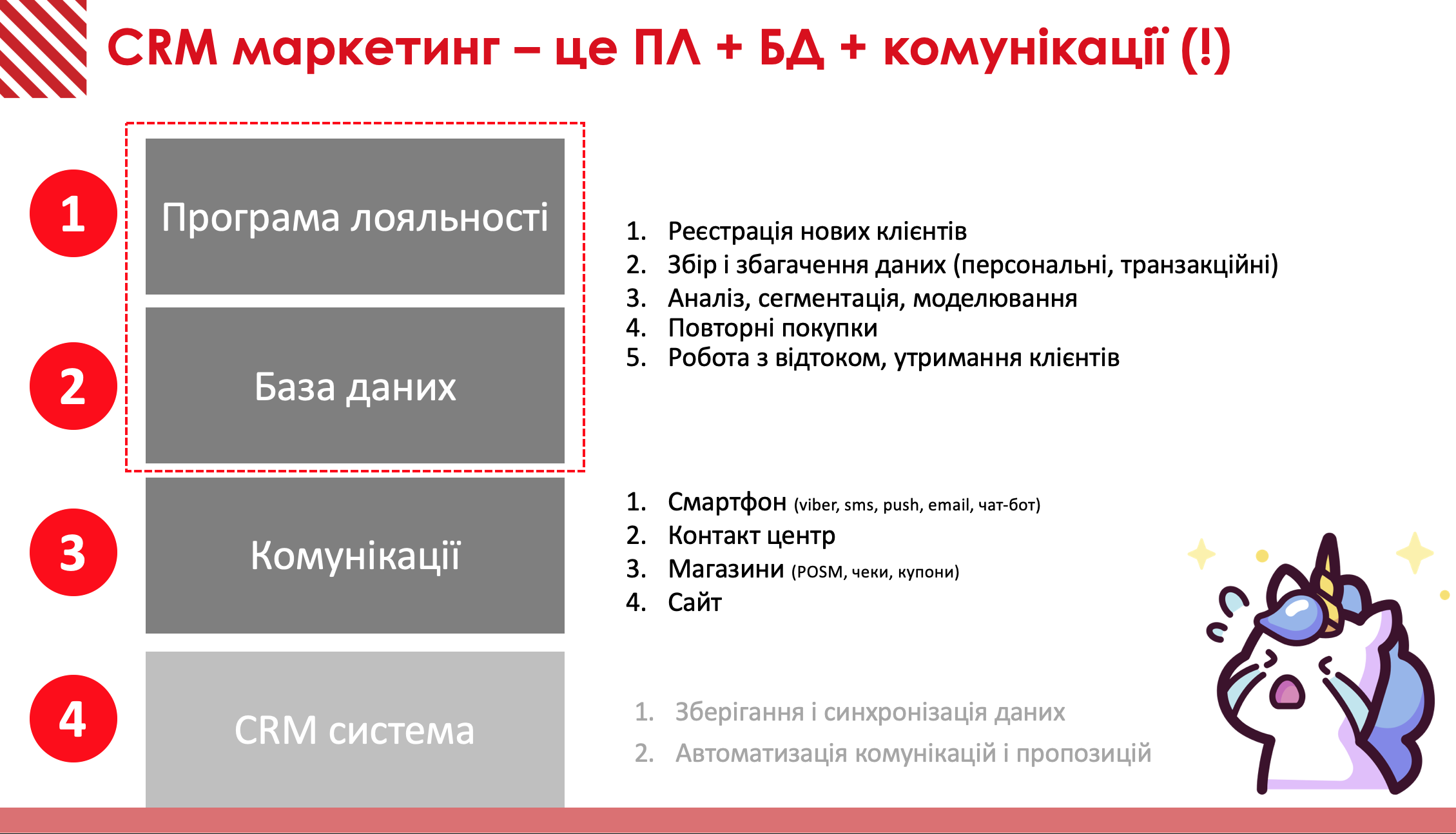 CRM маркетинг має три обов’язкових блоки і один необов’язковий. Обов’язкові блоки – це програма лояльності, база даних та комунікації, а не обов’язковий блок – це CRM система. Так, існує поширена думка, що якщо у компанії немає CRM системи, відповідно у неї немає і CRM маркетингу. Але це міф, оскільки тільки 5% компаній можуть собі дозволити встановити CRM систему, інші працюють в Excel. Але там де є персональна комунікація, є і CRM маркетинг.