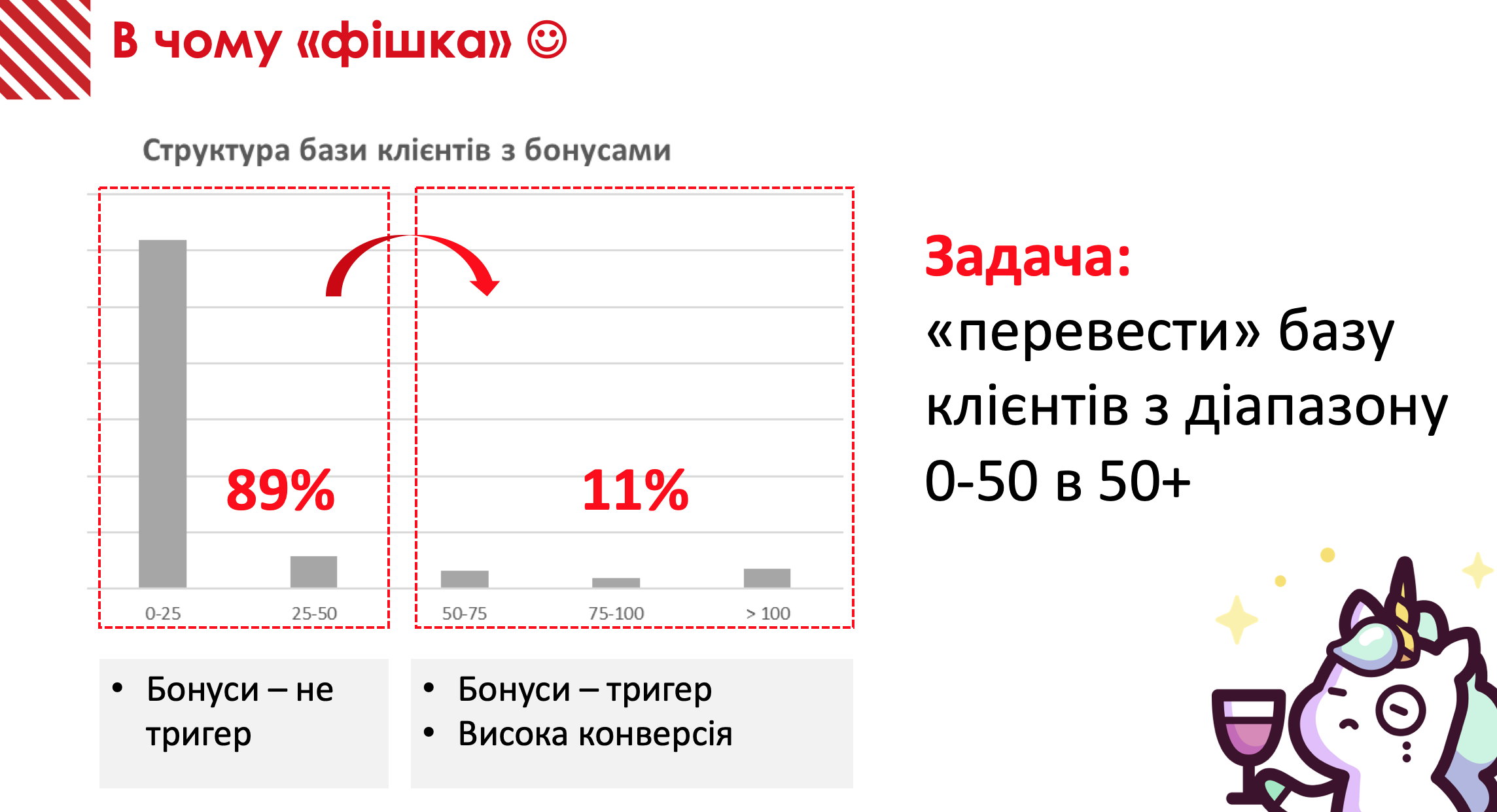 Тож, наша задача як CRM маркетологів збільшити кількість клієнтів, які мають на своєму балансі більше 50 бонусів. Тому ми збільшили нарахування бонусів з 3% до 5% за звичайні покупки, а також додали нарахування акційних бонусів у розмірі 20% від вартості покупки певних категорій товарів. Нариклад, нарахування 20% бонусів за покупку усіх футболок чи усіх вишиванок. Тут є фішка, яку ми винайшли всередині своєї мережі, зокрема, ми не нараховуємо бонуси за певні високовартісні товари (наприклад, за велосипеди), тому що тоді клієнту нараховується забагато бонусів і відповідно ми маємо низьку маржу.