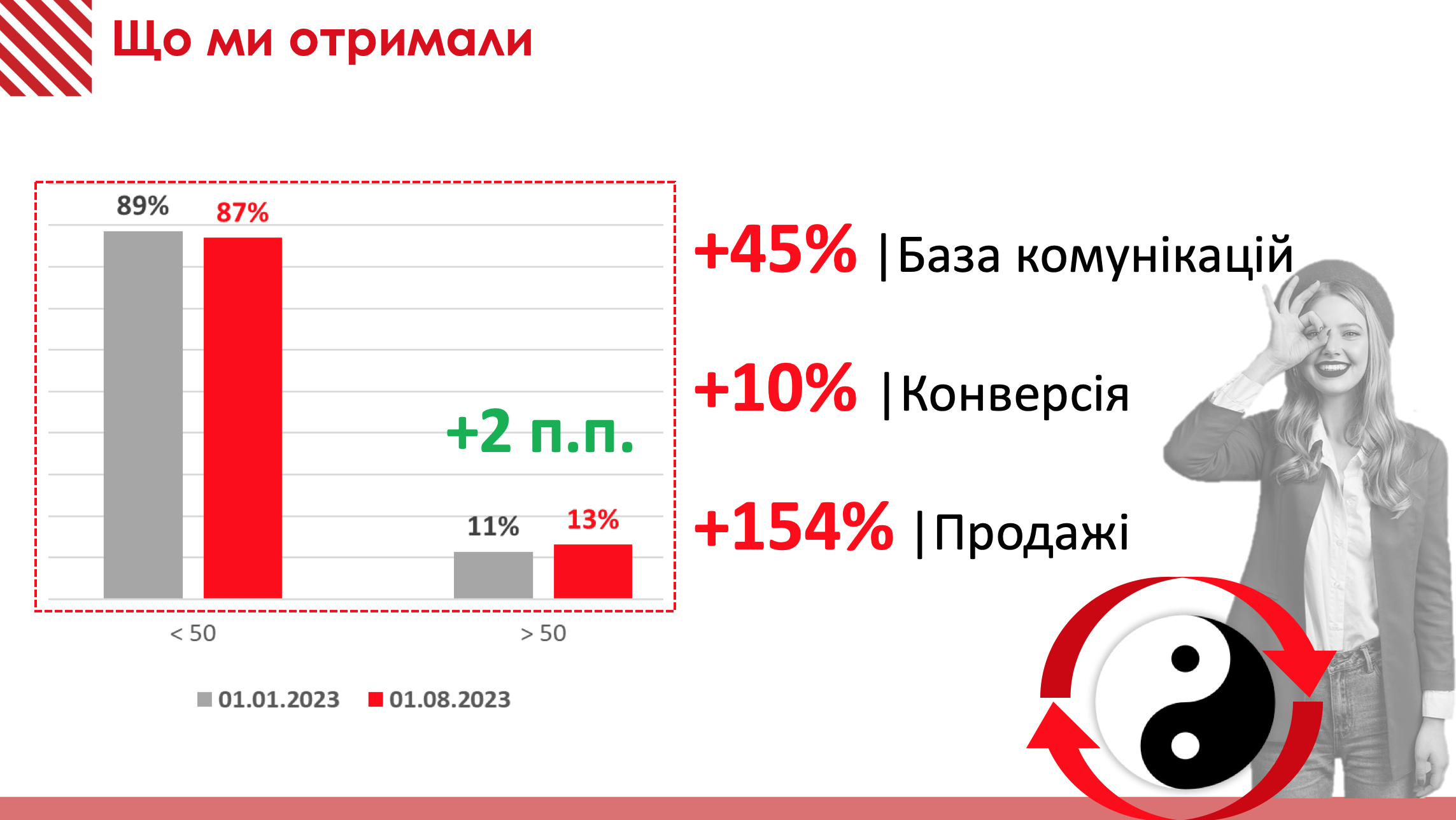 За півроку роботи оновленої програми лояльності ми перевели 2% наших клієнтів з діапазону до 50 бонусів на рахунку у діапазон від 50 бонусів на рахунку. На перший погляд – не незначний ріст. Але в той же час кількість пперсональної комунікації у нас зросла на 45%, а продажі за результатами комунікації про наявність бонусів збільшились у два з половиною рази. Для нас це дуже великі цифри.