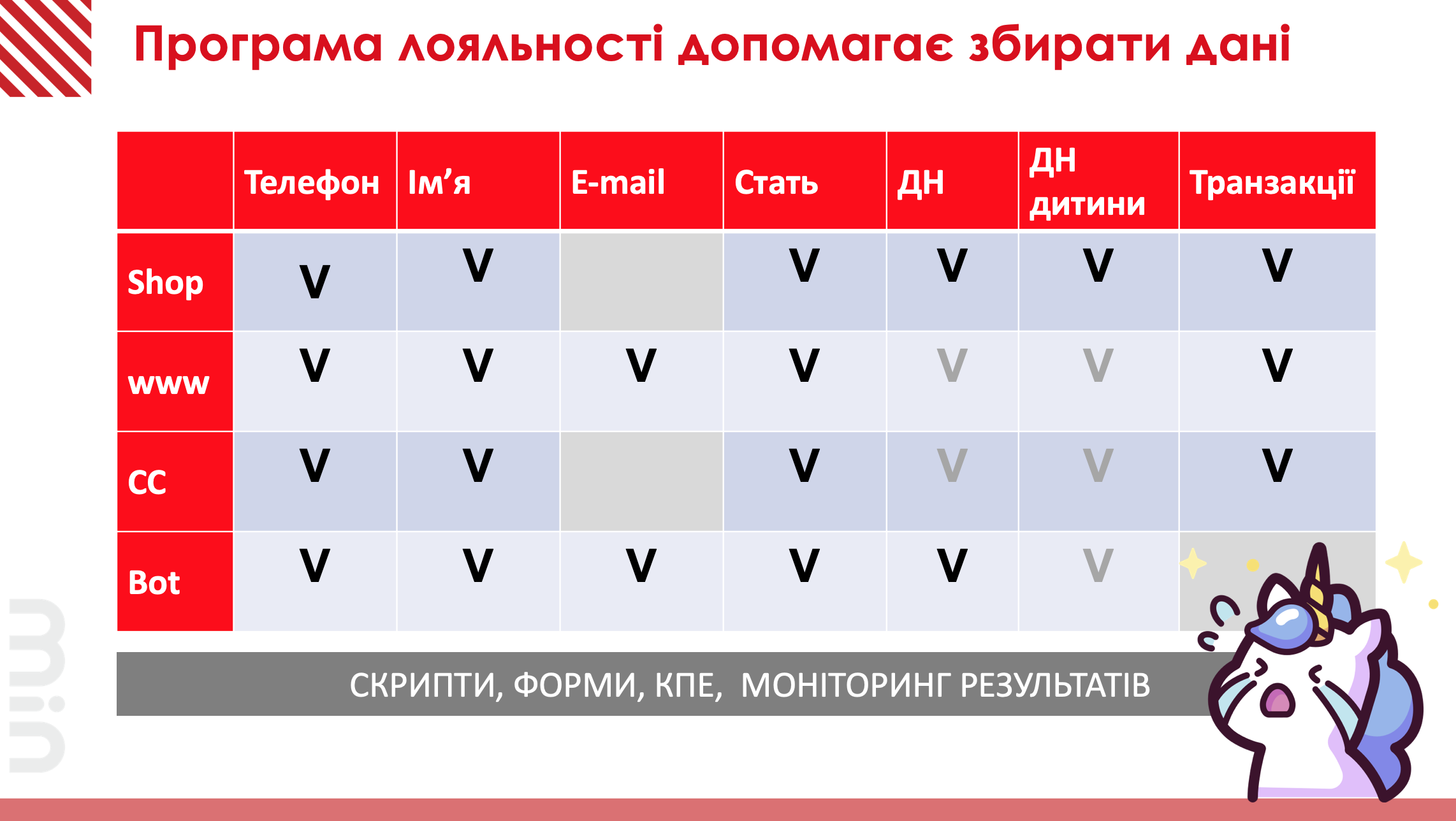 Нагадаю, що якщо ми маємо гарну програму лояльності, вона допомагає нам збирати дані. Ми збираємо усі дані, які клієнт готовий нам надати, в магазині, через сайті, email, контакт-центр та через чат-бот. Зокрема, ми збираємо наступну інформацію: ім’я, телефон, електронну пошту, стать, день народження, день народження дитини, а також усі транзакції з усіма даними, які в них є.