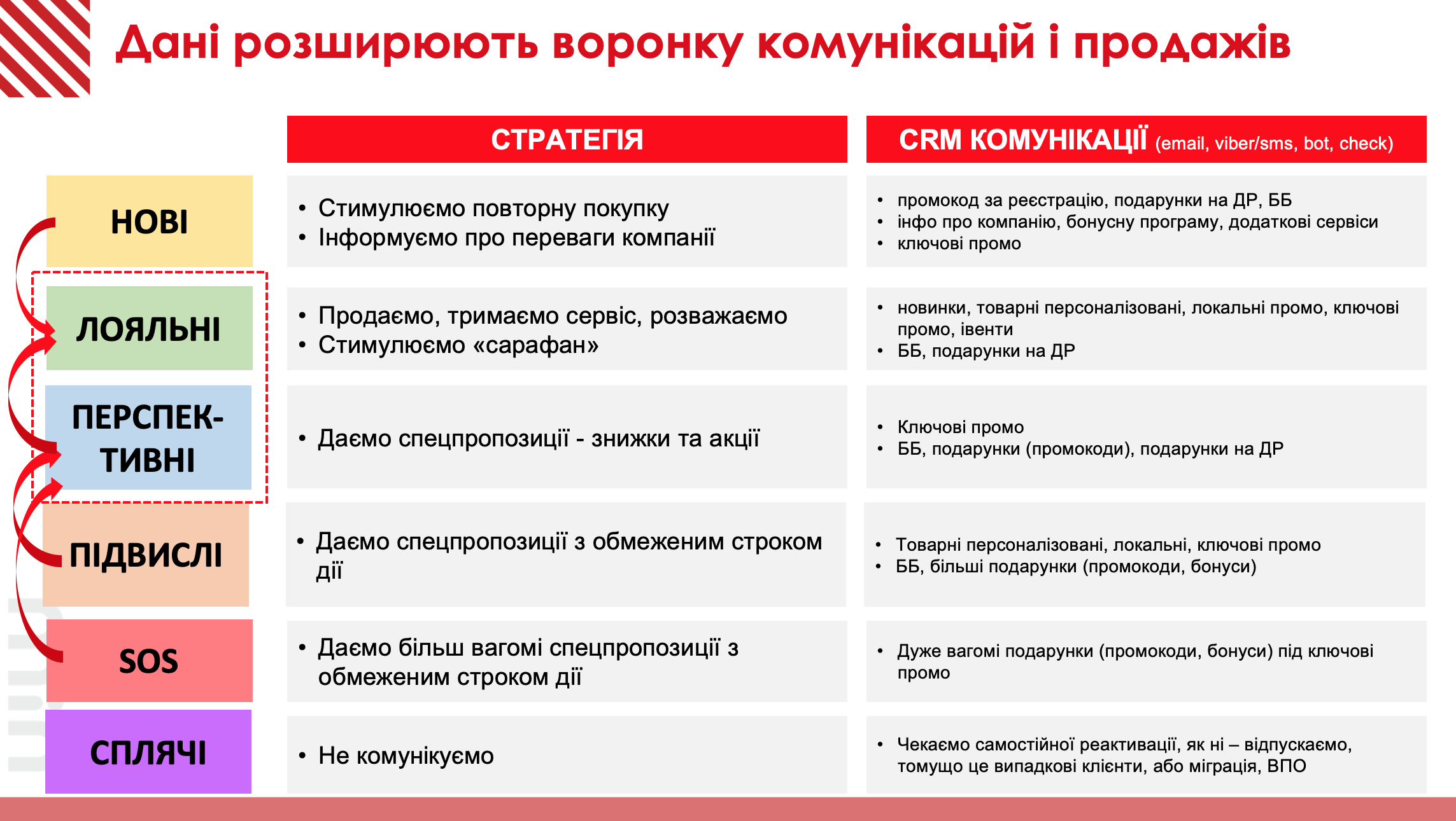 Для кожного сегменту клієнтів у нас окрема стратегія комунікації. Нових клієнтів ми закликаємо зробити повторну покупку на вигідних умовах, а також запрошуємо на різні цікаві івенти, де стимулюємо сарафанне радіо. Лояльням клієнтам ми продаємо все, що можемо продати, і також стимулюємо сарафанне радіо. А перспективним клієнтам даємо найкращі пропозиції з обмеженим терміном дії. А от зі сплячими клієнтами ми майже ніколи не комунікуємо за винятком великих подій як Чорна п’ятниця, коли оживають усі.