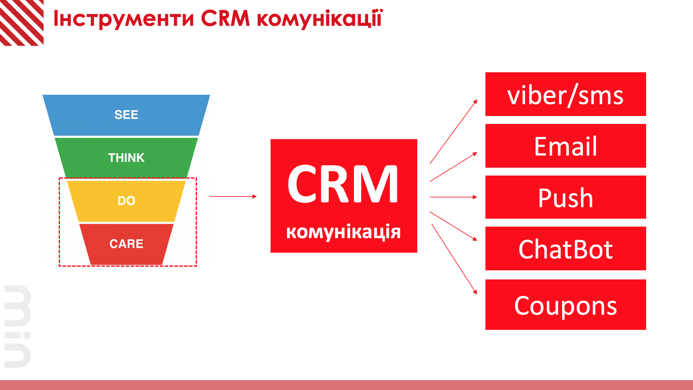 CRM – це система збільшення продажів через управління поведінкою клієнтів. Найкраще управляти поведінкою клієнтів, звісно, через персональні комунікації, де їх можливо проводити. Найчастіше для цього використовують Viber повідомлення, Push-овідомлення та електронну пошту. Також це можуть бути прямі комунікації через касира чи через контакт-центр.