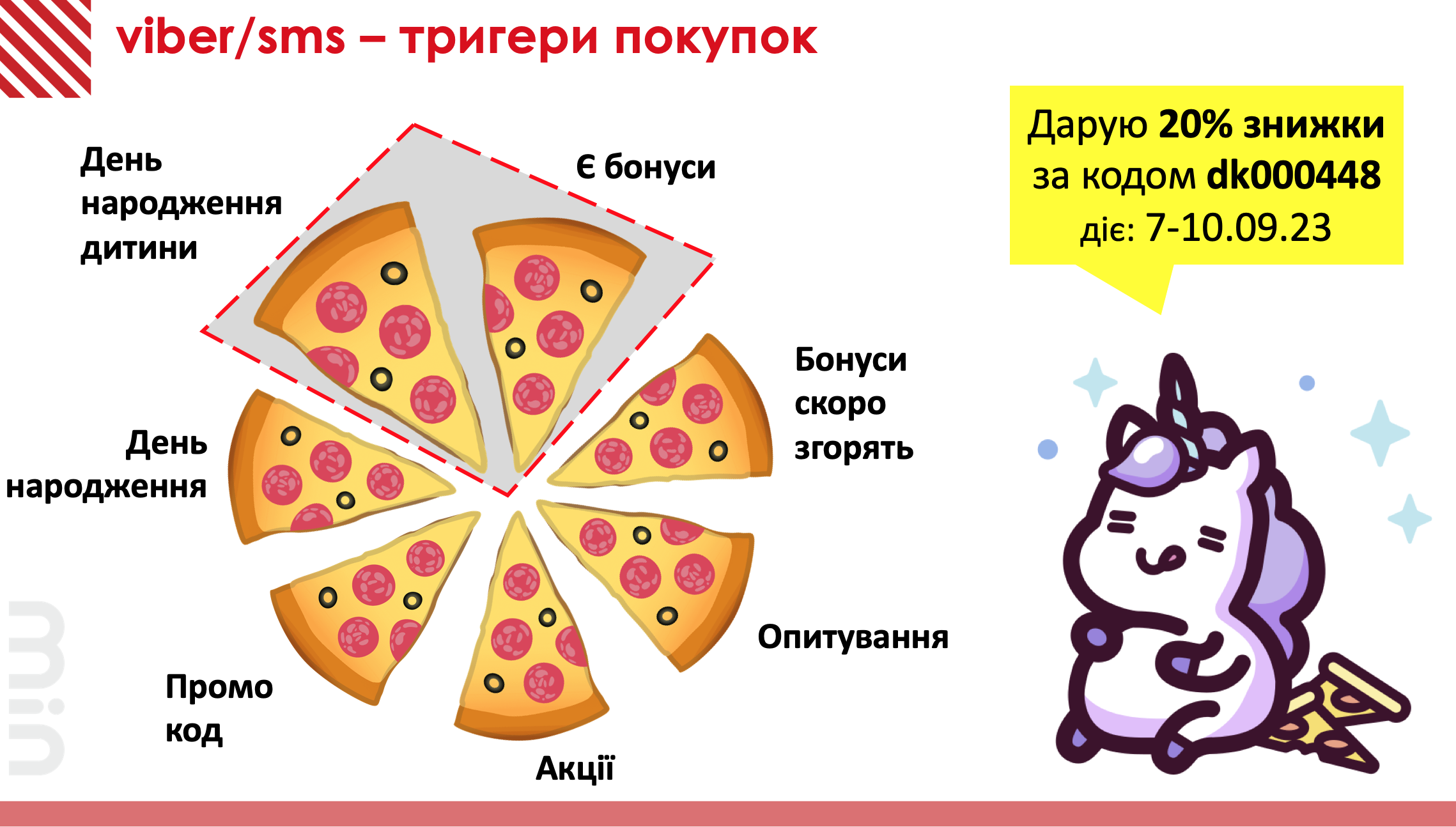 Через наші канали комунікації ми відправляємо не просто розсилку, а тригери для покупок. Найбільшими тригерами для покупок є день народження дитини та наявність бонусів на балансі, а також день народження клієнта, нагадування, що бонуси скоро згорять, акції, промокоди та опитування.