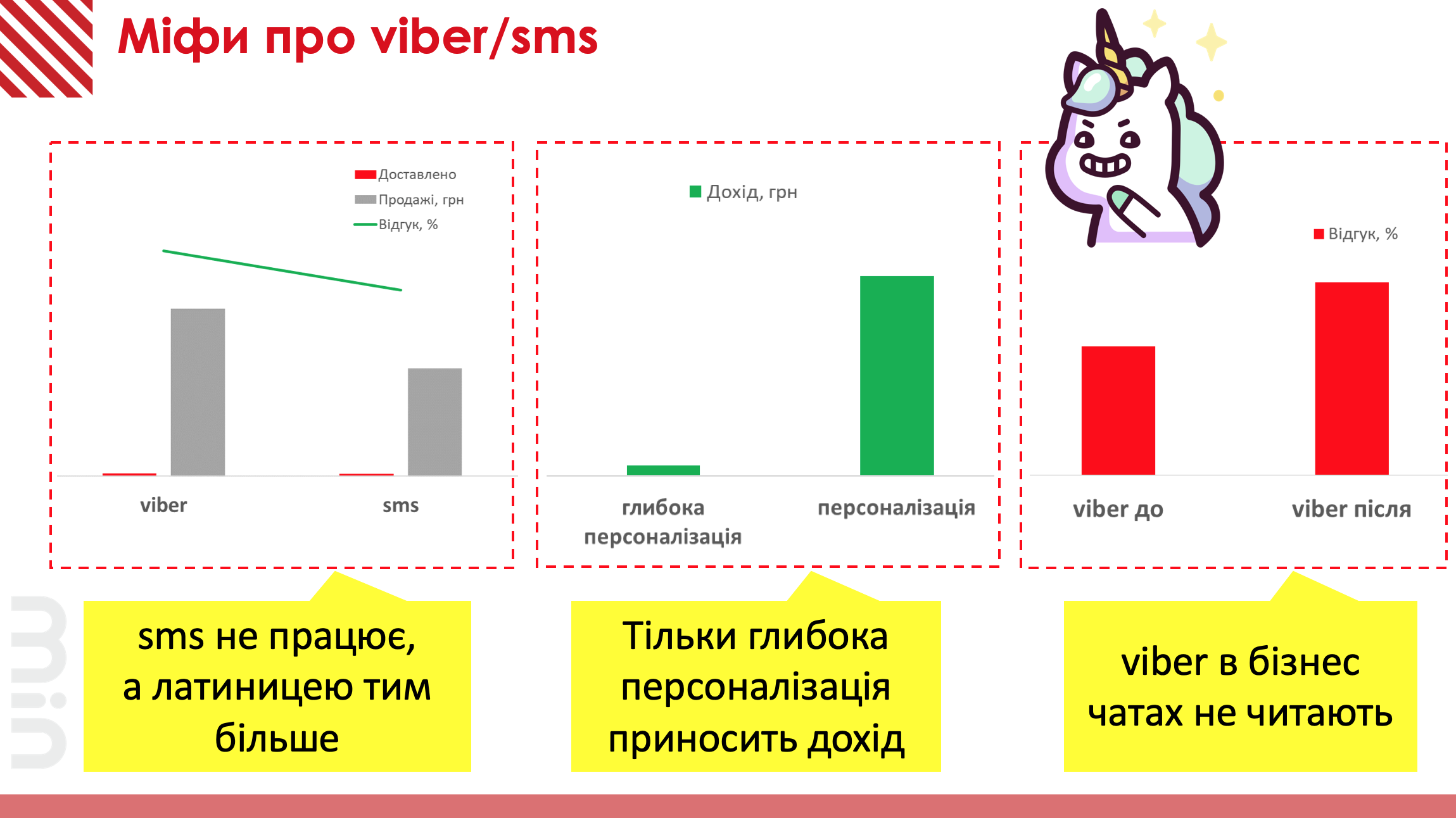 Міф номер один говорить про те, що СМС не працюють. Насправді, СМС мають вищу конверсію ніж Viber розсилка. Ці розсилки сумарно складають 30% доходу від усіх Viber та смс розсилок. До того ж, СМС закривають комунікацію з тими клієнтами, з якими з певних причин не можна комунікувати через Viber.