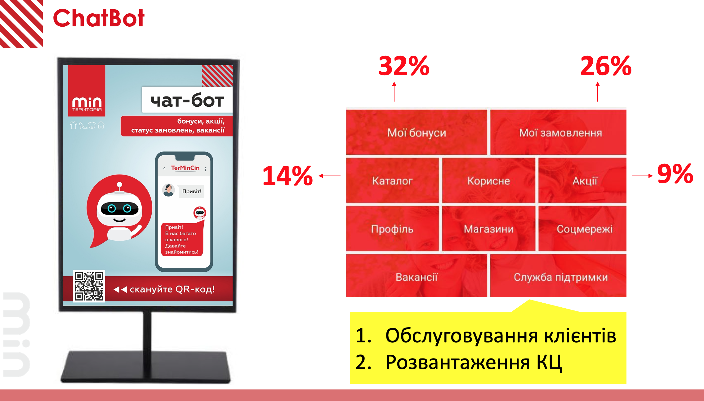 Останній наш канал комунікації з клієнтами – чат-бот. Напряму він нам не генерує продажі, але він нам економить витрати. Найчастіше клієнти мають два запити “скільки в мене бонусів” та “який статус мого замовлення”. Після того як ми зробили чат-бот, ми бачимо, що за бонуси запитує 32% клієнтів, а про статус замовлення – 26%.