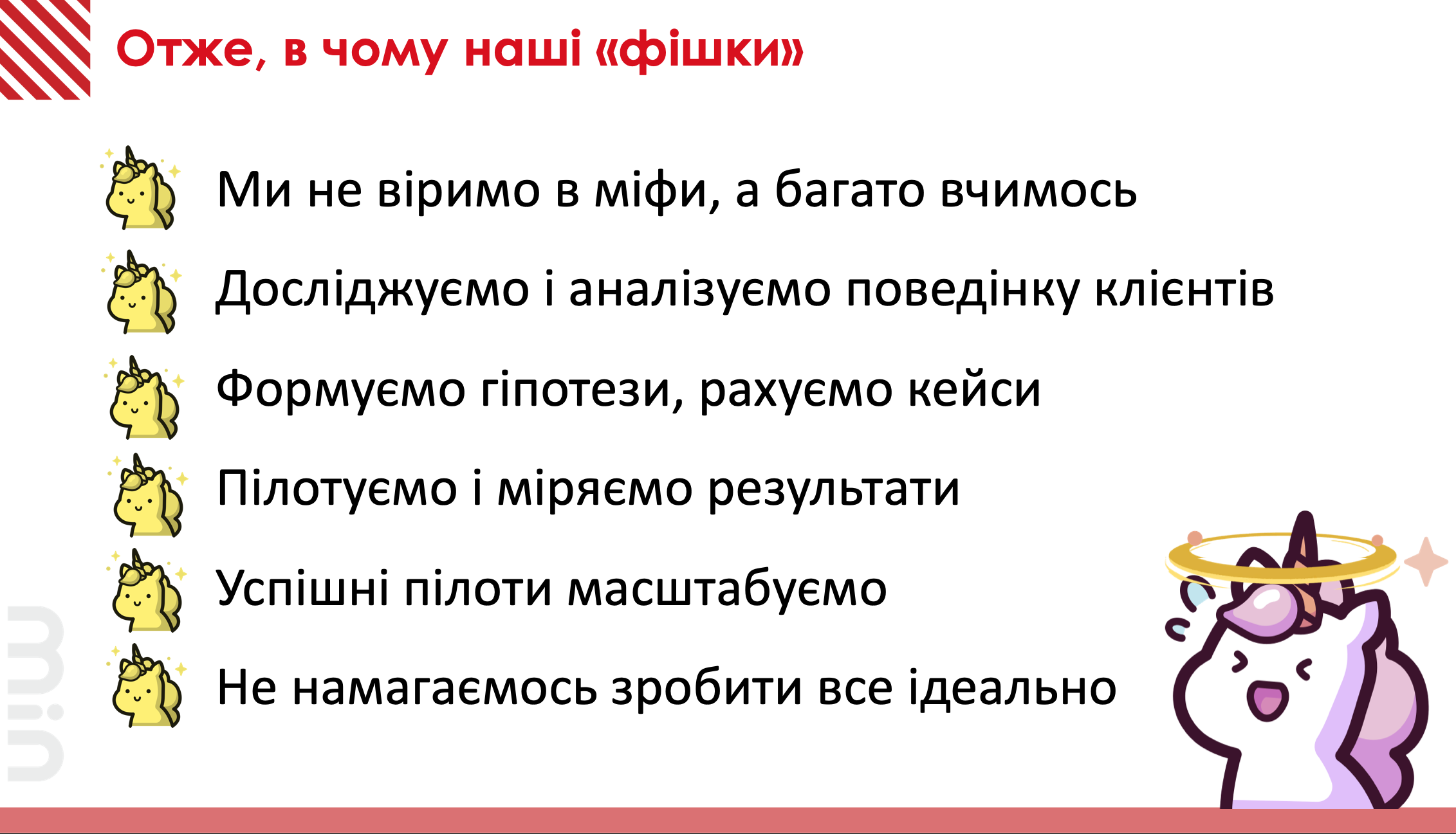 Основна наша фішка полягає в тому, що ми не віримо в міфи і все самостійно тестуємо Якщо ми маємо певну гіпотезу, ми її міряємо. Якщо вона працює, ми її масштабуємо. Крім того, одній і ті ж гіпотези потрібно періодично тестувати, оскільки те, що не працює сьогодні, може працювати через півроку, рік чи через два роки.