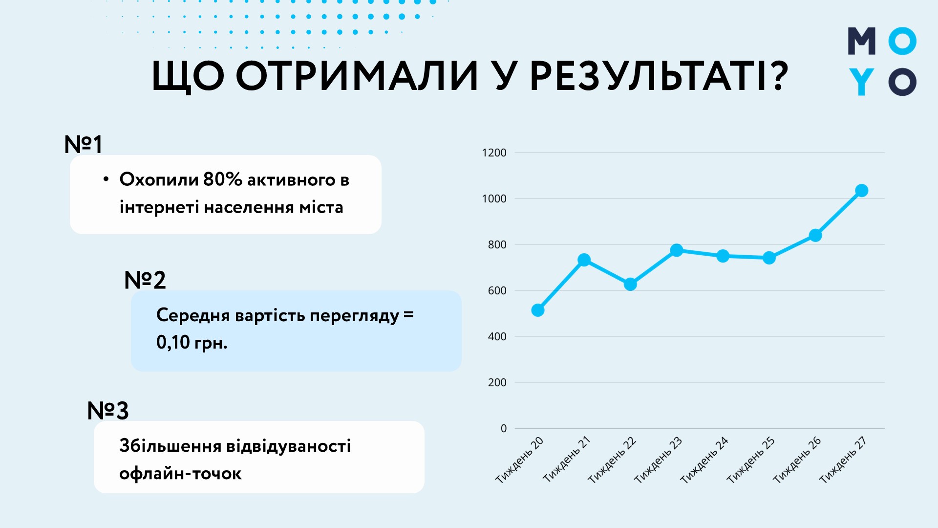 Запустивши просування у невеликих містах через відеоконтент мали високу кількість показів, широке залучення аудиторії, яка в середньому бачила мінімум три відео різного наповнення та бюджет на просування був розумним.