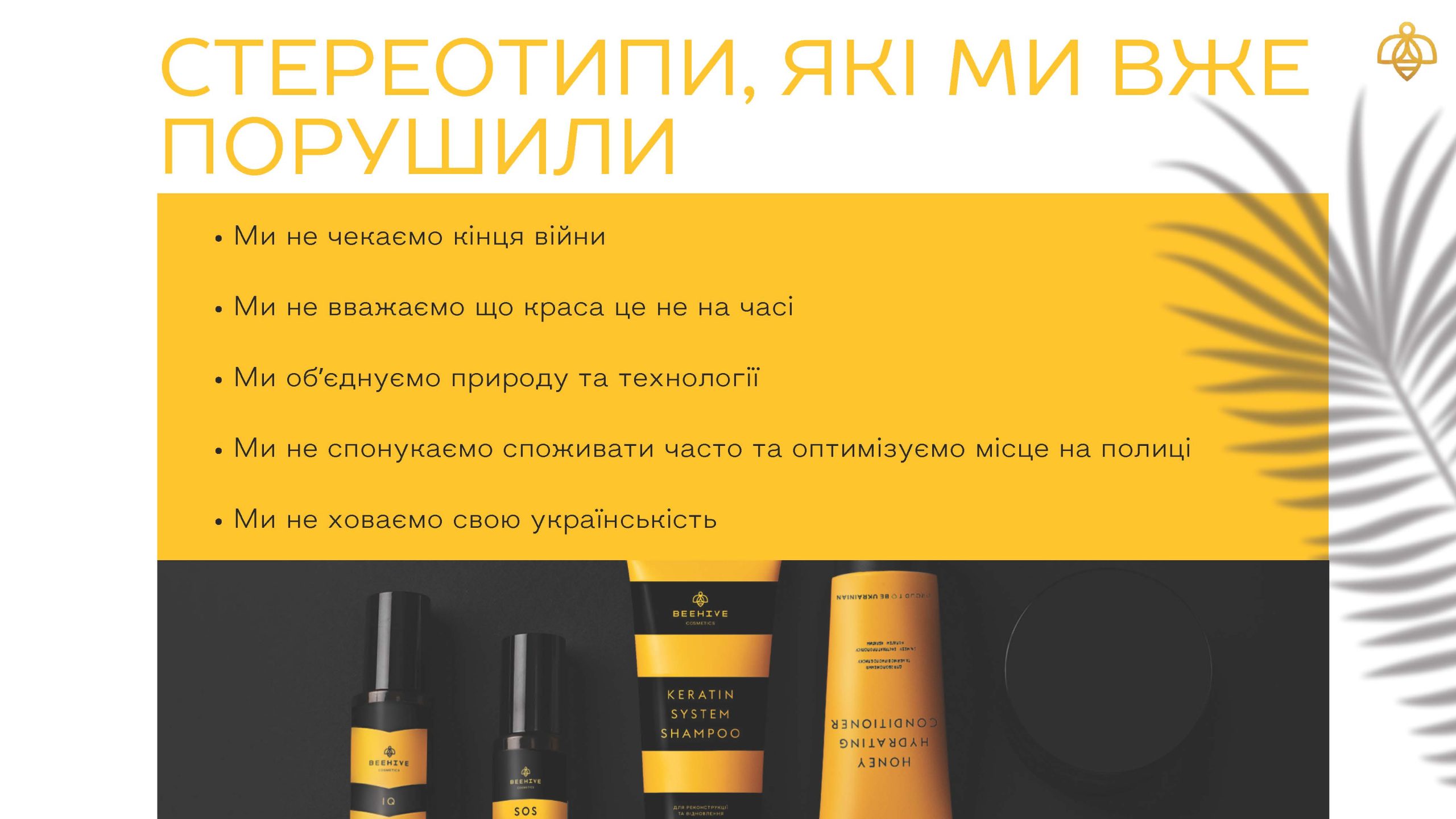 Тому на відміну від більшості брендів, де споживачу пропонується в середньому 20 SKU з різницею у наповненні певними інгредієнтами на рівні менше відсотка, Beehive Cosmetics запропонувала дуже лаконічну лінійку на 7 SKU. Три шампуні, кондиціонер, крем-маска, серум та спрей, з яких жінка може обрати 2-3 позиції саме під свій тип волосся. Тим самим оптимізуємо місце на полиці.