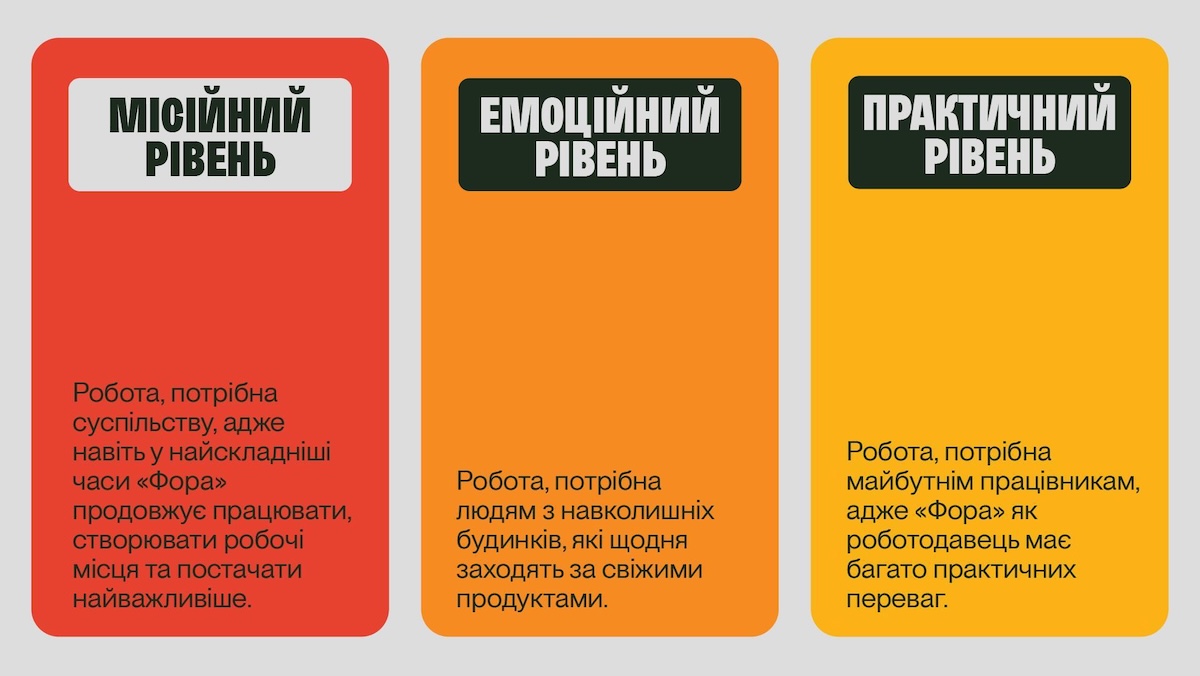 “У позиціюванні “Робота, потрібна людям” ми поєднали емоційні та раціональні переваги роботи у Фора. Вона завжди буде потрібною людям з навколишніх будинків, адже їм і у часи кризи та непевності, і на свята, і на щодень завжди потрібні свіжі продукти. І тому саме така затребувана, стабільна та прогнозована робота у великій компанії завжди потрібна людям, які її шукають“, — пояснила креативна копірайтерка Taktika Олександра Зіненко.